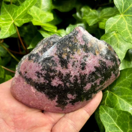 Rhodonit pink, en side poleret 9 cm, flot liggende