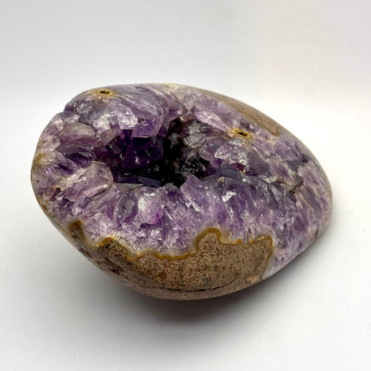 Ametyst kan nemt renses ved at skylle den under lunkent vand og tørre den forsigtigt med en blød klud. For energirensning kan du lade den ligge i måneskin natten over eller placere den på en selenitplade. Undgå direkte sollys i længere tid, da det kan få farven til at falme.