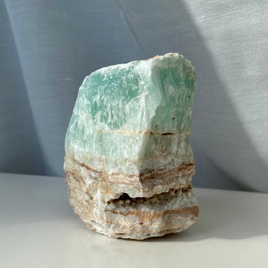 Caribisk calcit er en fascinerende sten, der kombinerer bløde blå og hvide nuancer, ofte med beige eller brune bånd. Den består af en blanding af blå calcit og hvid aragonit, hvilket giver stenen dens karakteristiske udseende. Caribisk calcit symboliserer ro, klarhed og følelsesmæssig heling. Dens beroligende farver minder om tropiske strande og havet, hvilket gør den populær blandt dem, der søger fred og harmoni.