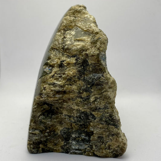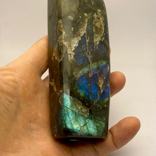 Labradorit er en fascinerende krystal kendt for sin iriserende glans, der minder om nordlyset. Den er et medlem af feldspatgruppen, den mest almindelige mineralgruppe på Jorden. Labradorit findes i forskellige farver, men den er mest kendt for sine blå, grønne og grå nuancer. Den kan også være farveløs, brun, gul eller orange.