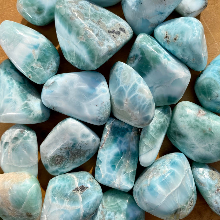 Larimar er en sjælden og smuk sten, der kun findes i Den Dominikanske Republik. Den er kendt for sine lyseblå og havgrønne nuancer, som minder om havets bølger, ofte med hvide årer og mønstre. Larimar forbindes med vandets energi og symboliserer ro, harmoni og kommunikation.