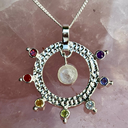 Chakra harmoni vedhæng | 925 Sterling Sølv, 7 krystaller og månesten