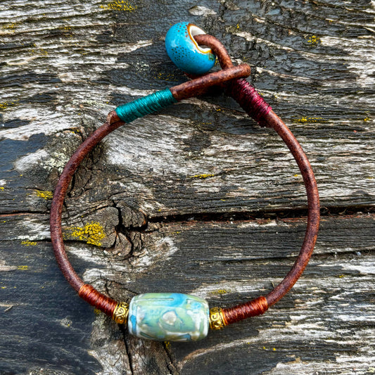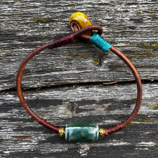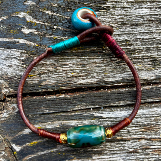 Herre armbånd | dybe blågrønne nuancer | læder, keramiske perler og messing