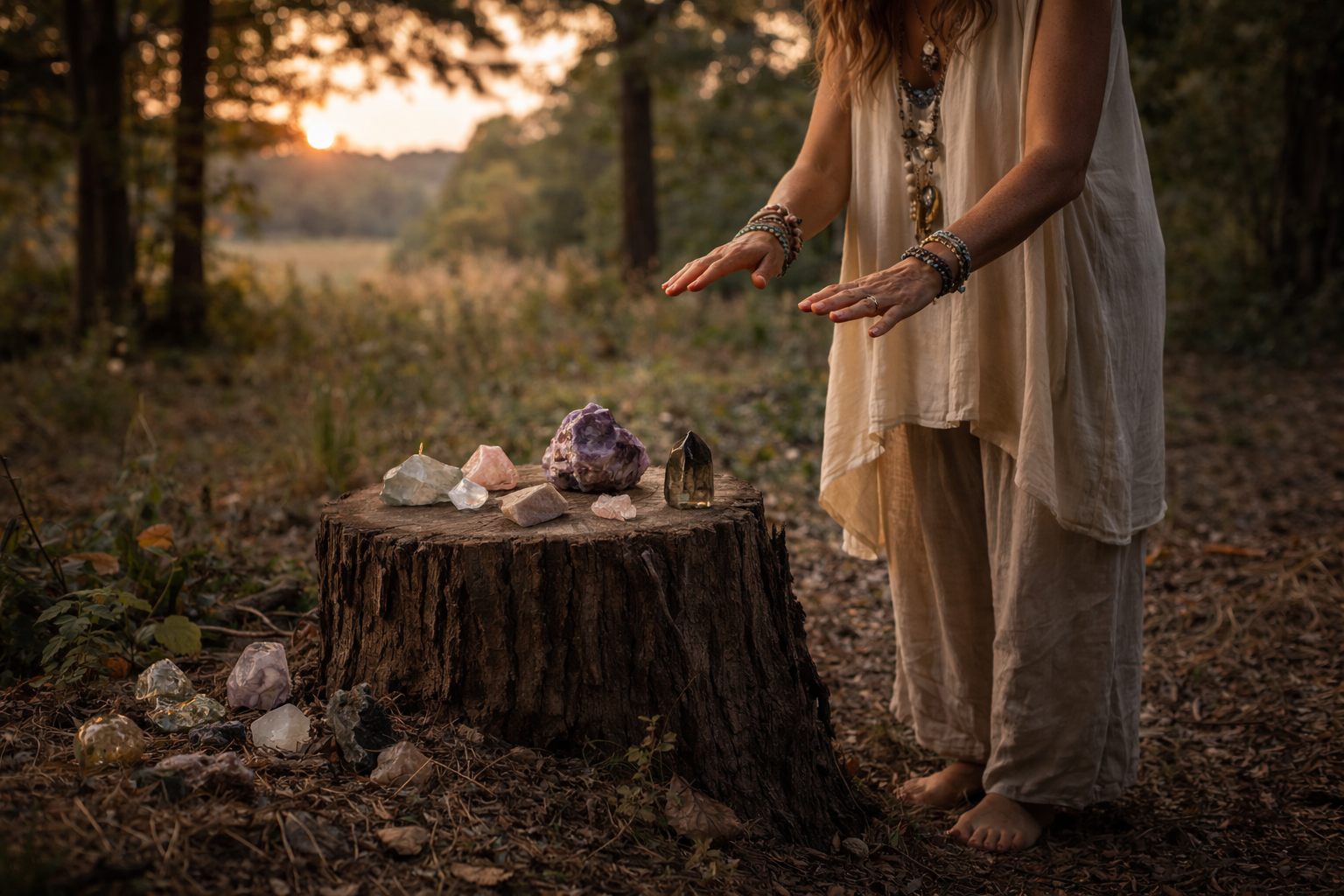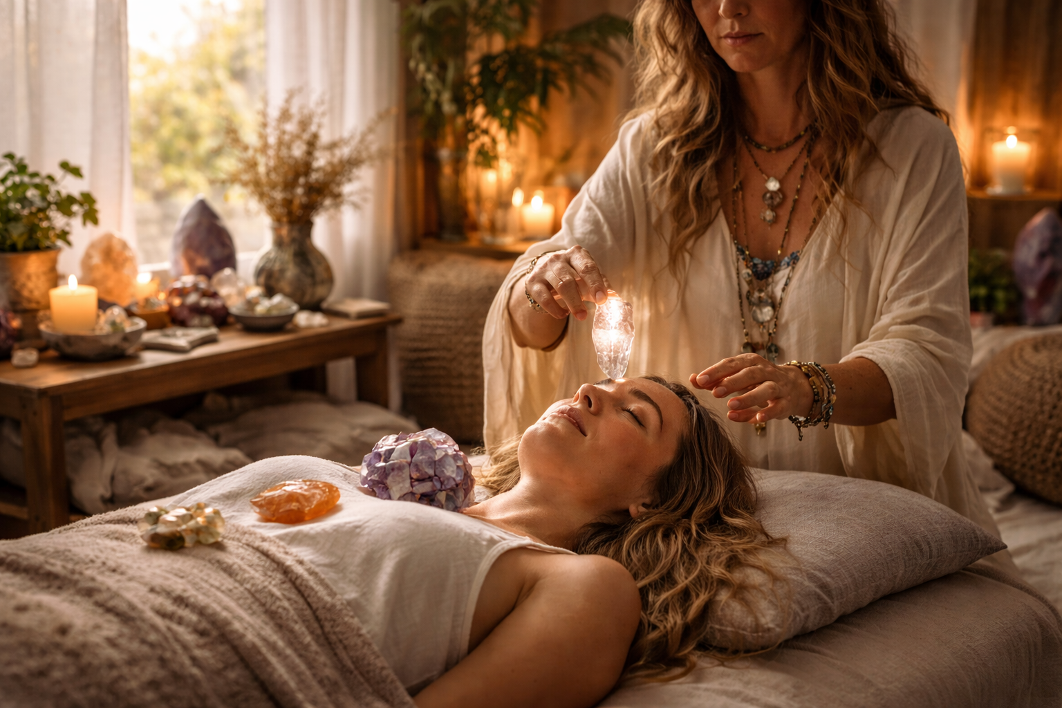 Healing ved krystalpålæggelse samler krop, åndedræt og sten i en enkel, bevidst handling. Krystallerne placeres med præcision og skaber tyngde og retning, mens roen breder sig og opmærksomheden forankres i det, der mærkes her og nu.
