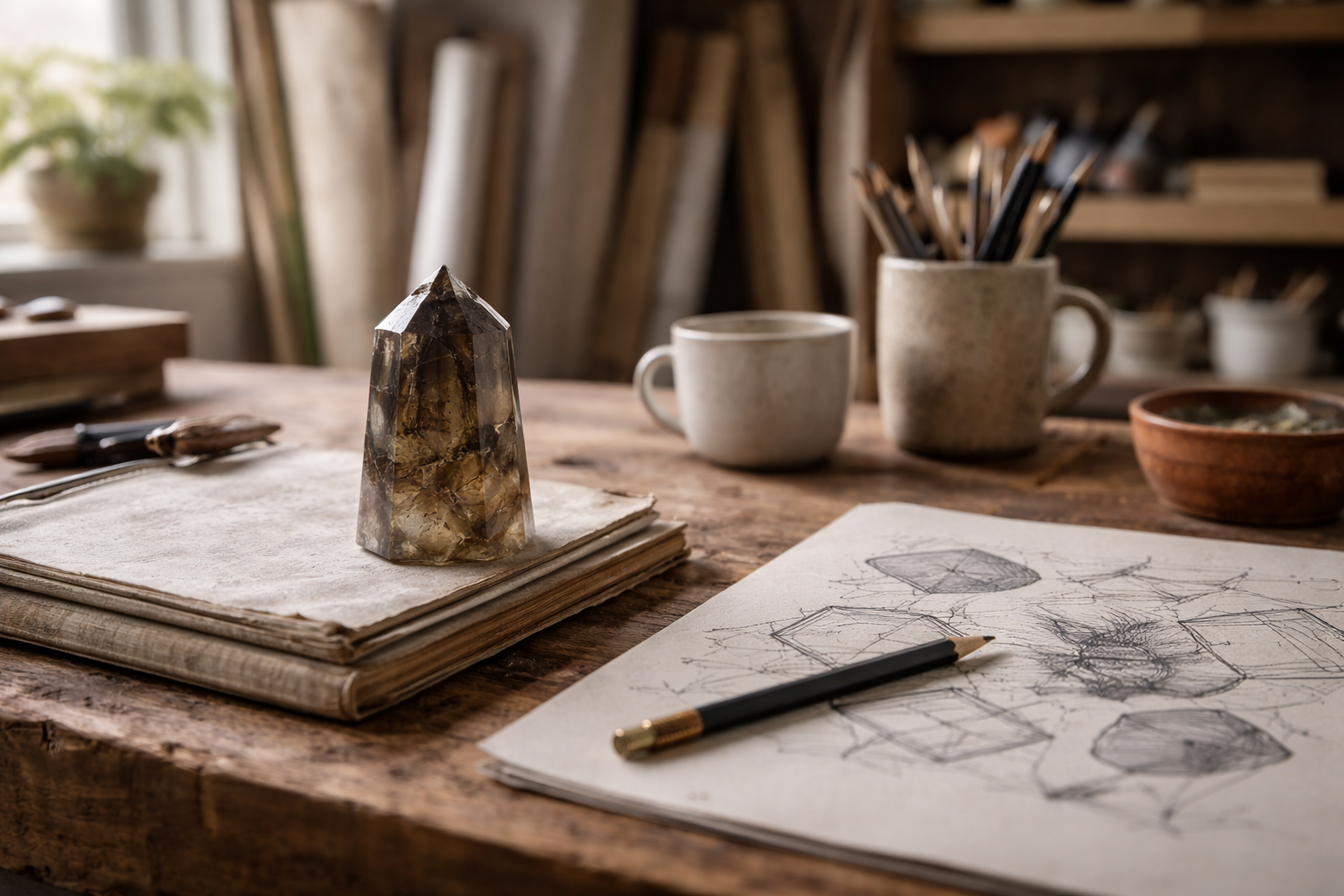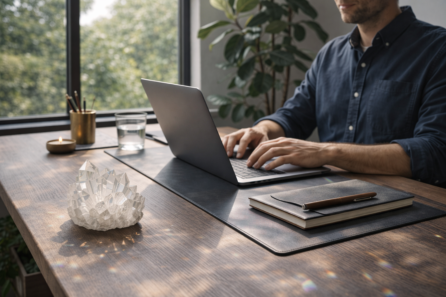 Krystaller på arbejdspladsen tilfører ro og retning mellem skærme, papir og klare linjer. De står som faste holdepunkter i et funktionelt rum og bringer naturens struktur ind i hverdagen, hvor fokus, beslutninger og flow skal hænge sammen.
