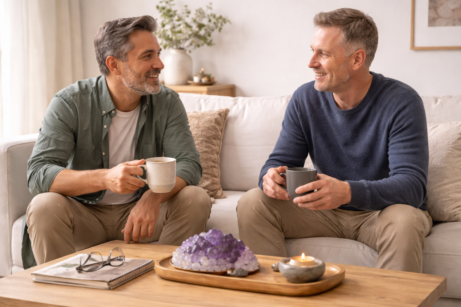 Den dejlige samtale mellem to udfolder sig i et rum, hvor krystaller, lys og enkle materialer skaber en rolig ramme. Ordene falder frit, blikkene mødes, og nærværet får plads, mens stemningen bæres af varme og ægte opmærksomhed.