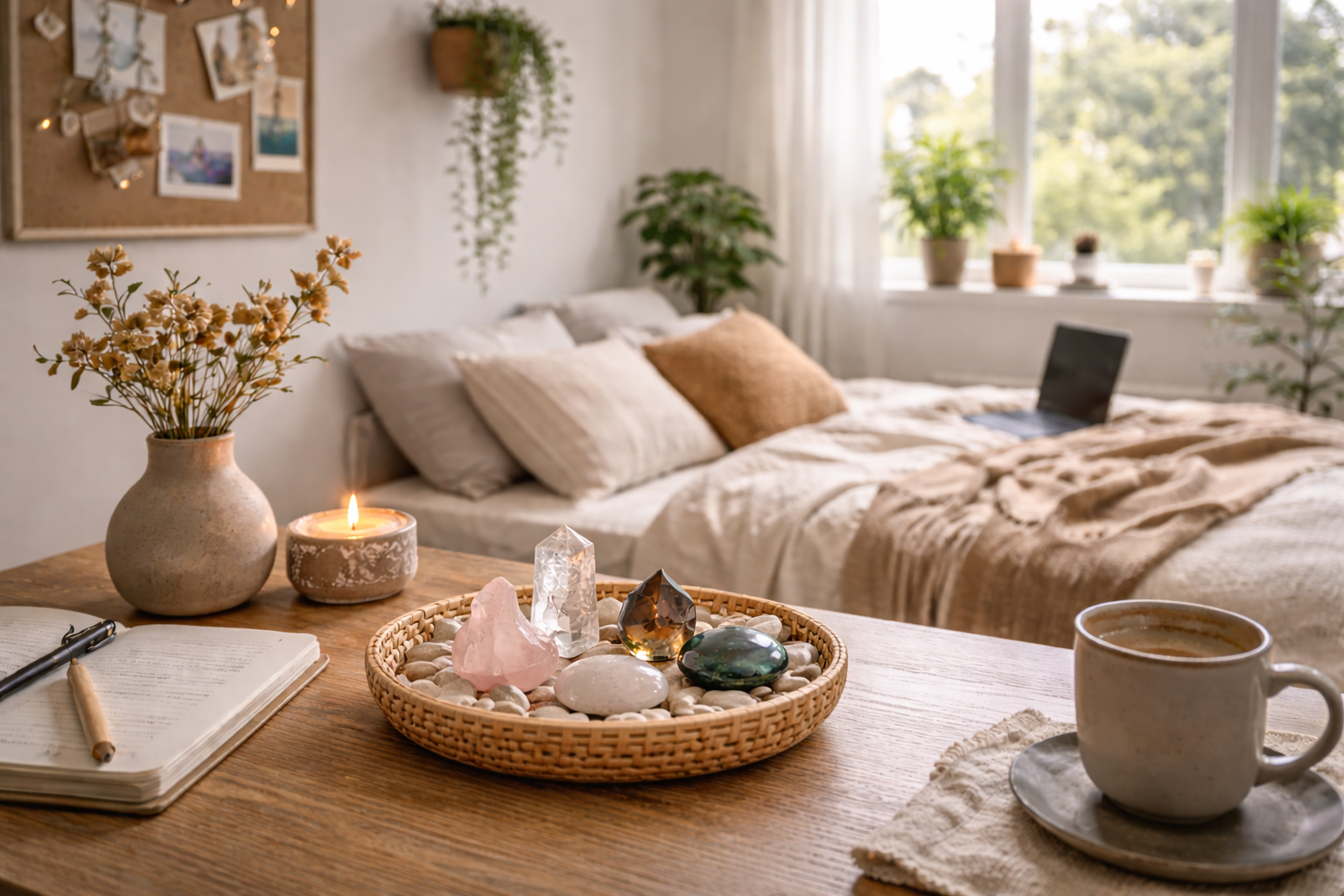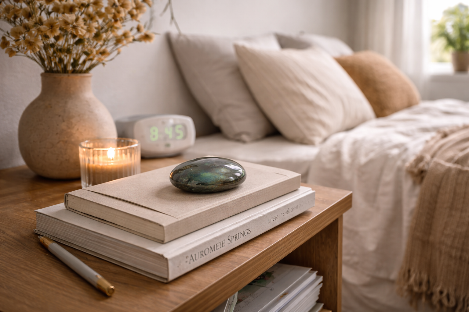 Fokus på fordybelse i soveværelset skabes med krystaller mellem bløde tekstiler, træ og dæmpet lys. De samler rummet og giver tyngde til stilheden, så tanke, læsning og indre ro kan få plads i en enkel, tryg ramme.