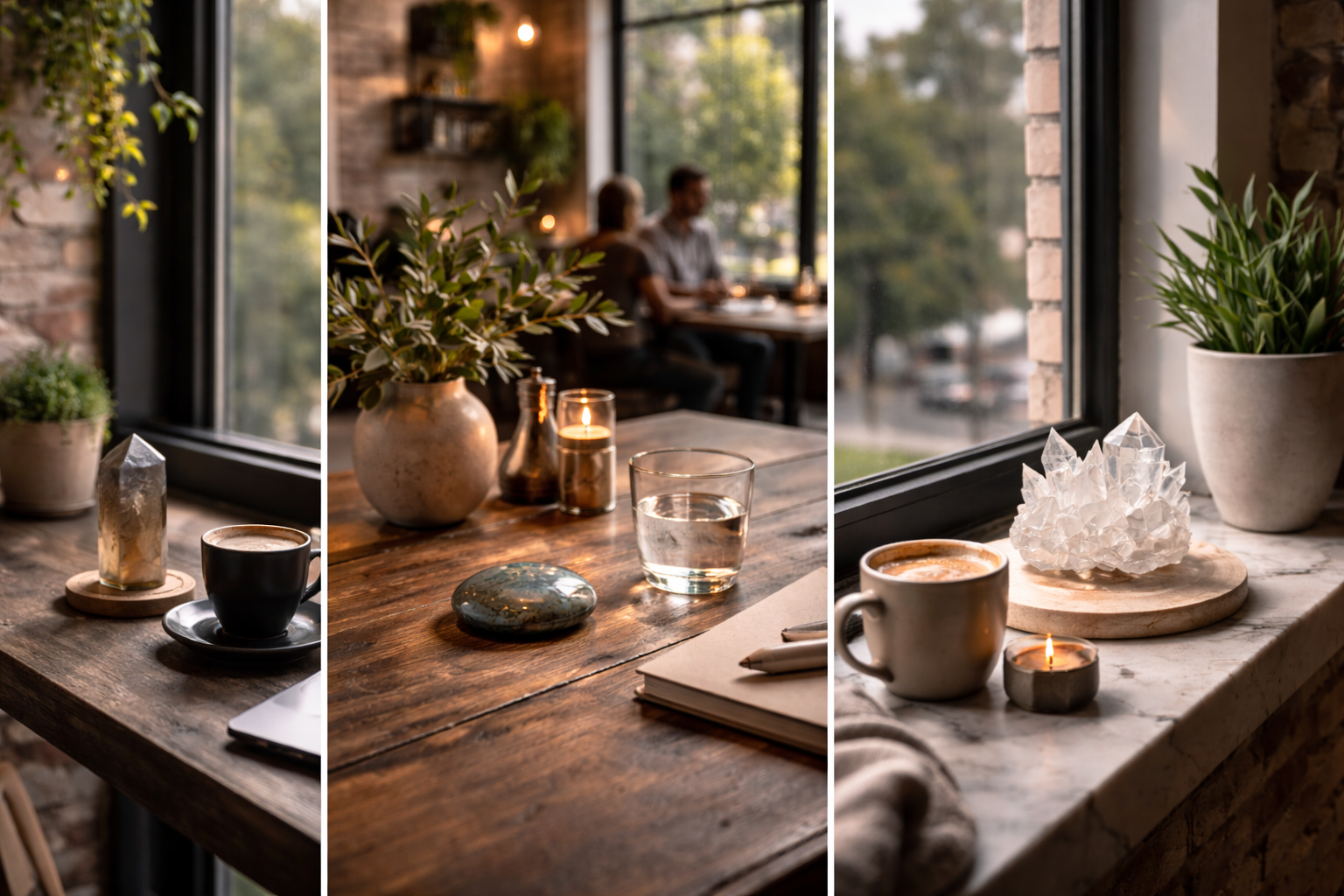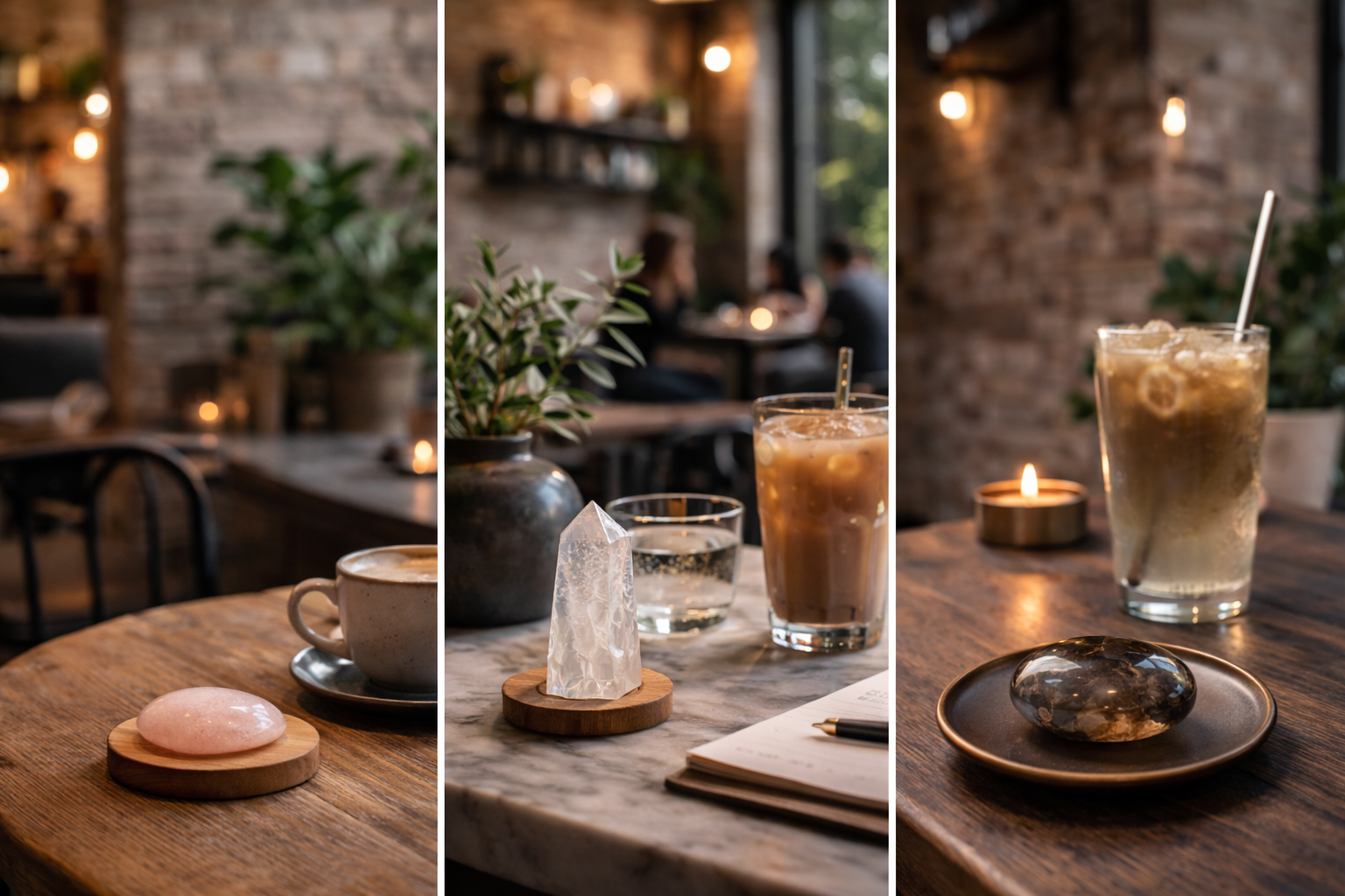 Krystaller i den hyggelige café nede om hjørnet tilfører karakter mellem kaffekopper, træborde og dæmpet lys. De står diskret i vindueskarmen eller på disken og binder det rå og det bløde sammen i en stemning, der føles både lokal og levende.