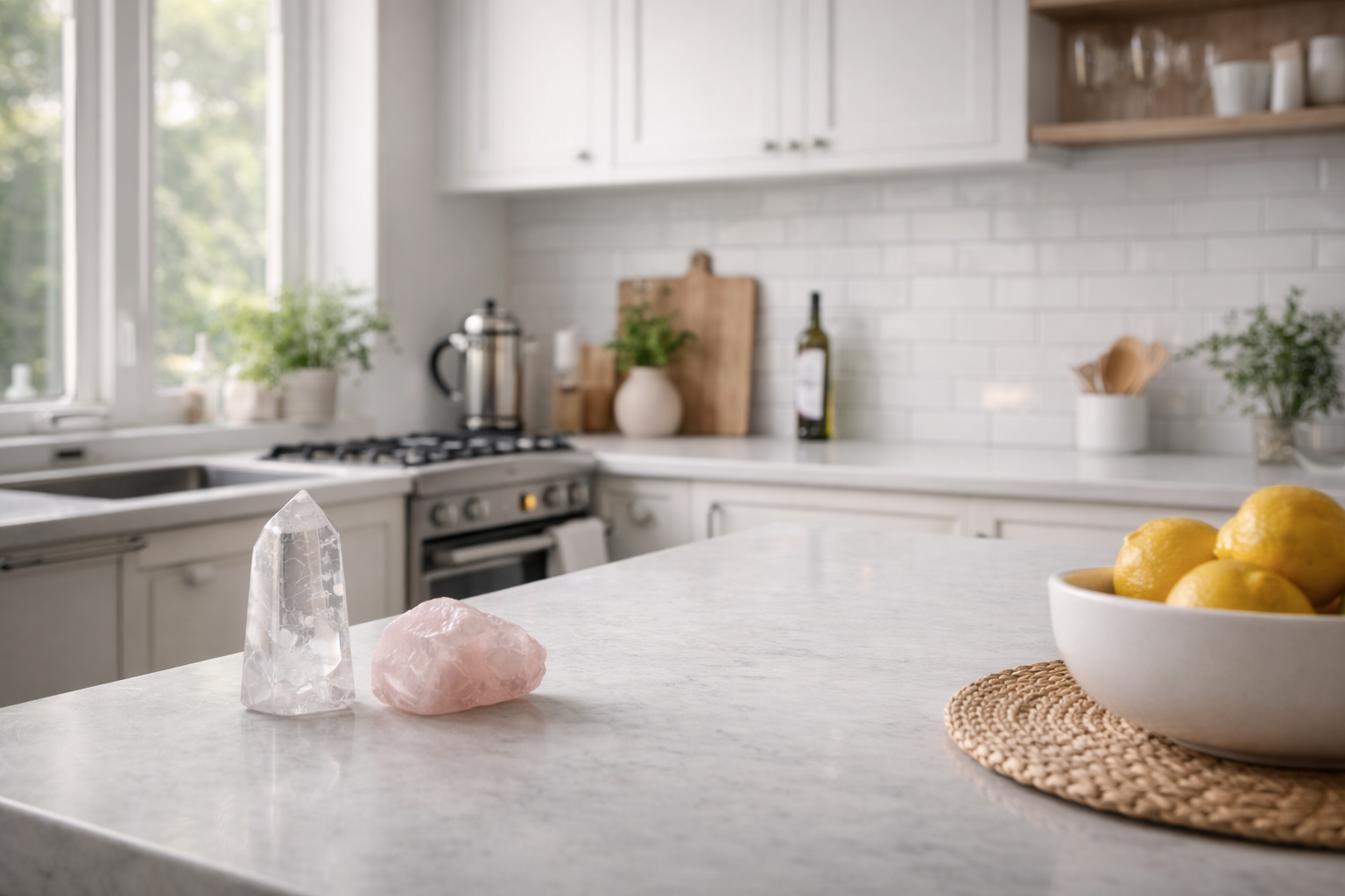 Krystaller i det enkle, rene køkken tilfører ro og karakter mellem lyse flader, træ og keramik. Stenens klare former står præcist mod de rene linjer og skaber en stille balance, hvor funktion og natur mødes i et ærligt, harmonisk udtryk.