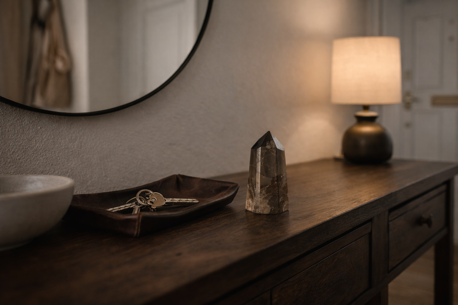 Entréen som tærskel for hjemkomst samler krystaller, træ og lys i det første møde med hjemmet. De står som rolige markører ved døren og skaber en klar overgang mellem verden udenfor og den stemning, man træder ind i.