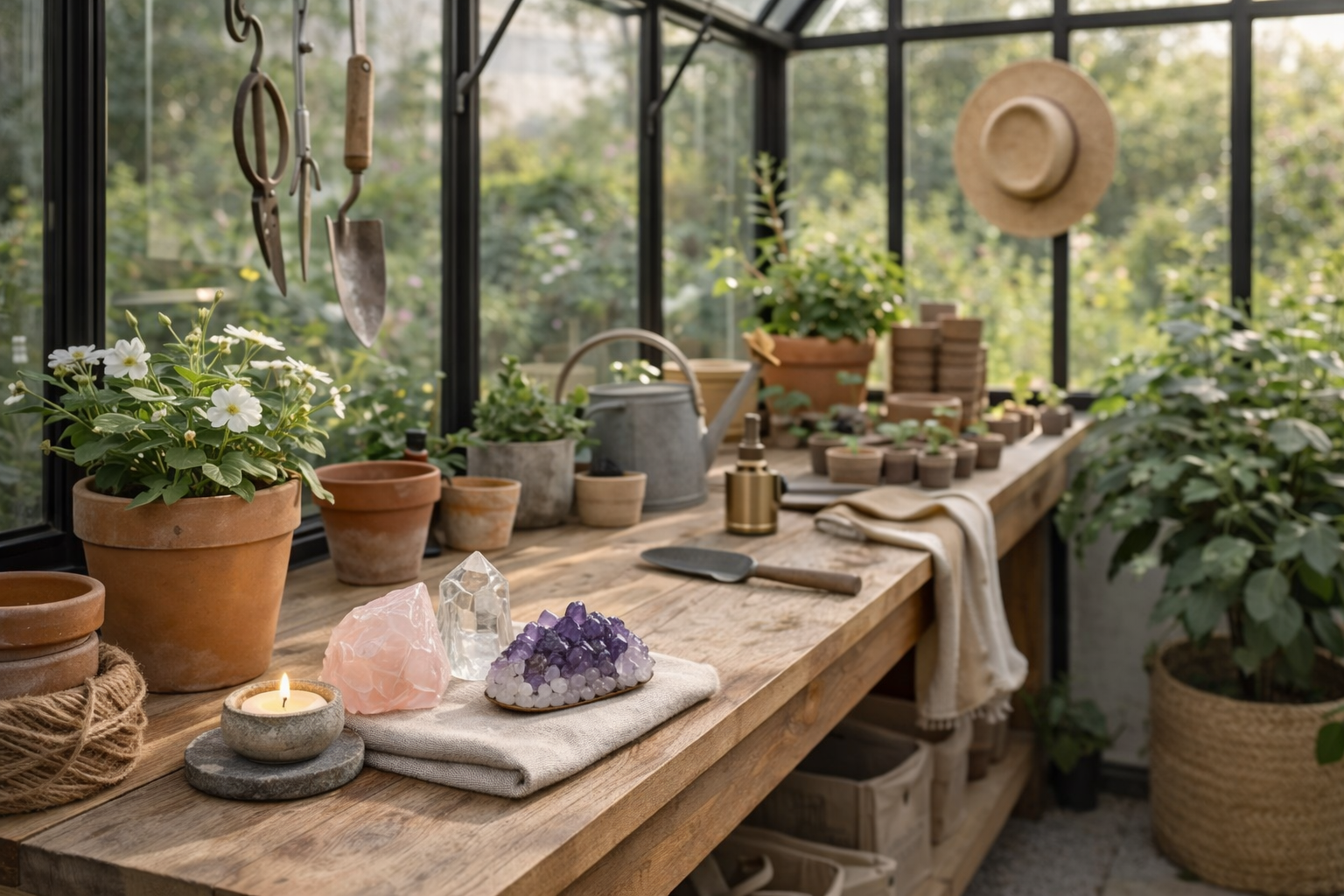 Her er der et særligt liv mellem grønne blade, varm jord og duften af krydderurter. Glas, fugt, sollys og sten spiller sammen og skaber en sanselig helhed, hvor naturens former og krystallernes klare struktur løfter hinanden.