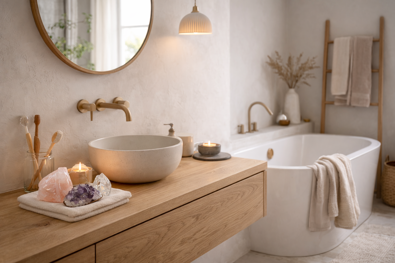 Sublim ro i badeværelset opstår, når krystaller står mellem fliser, vand og rene linjer. Stenens faste form møder spejlets klarhed og det bløde lys, så rummet får en enkel, afbalanceret tyngde.