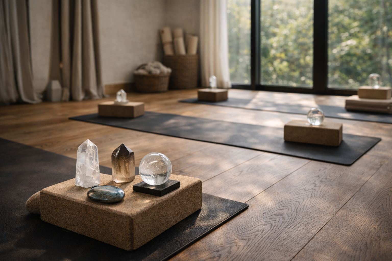Krystaller i yogastudiet står roligt mellem måtter, træ og dæmpet lys. Deres former samler rummet og giver tyngde til den enkle indretning, mens sten, krop og åndedræt falder ind i samme rytme.