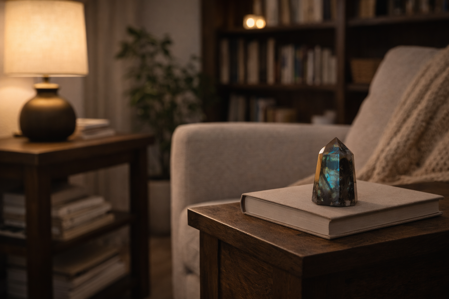 Fokuskrystallen til fordybelse i bøger står roligt ved siden af sider og noter. Dens klare form samler opmærksomheden og skaber en fast rytme i rummet, hvor ord, tanke og nærvær kan falde på plads.