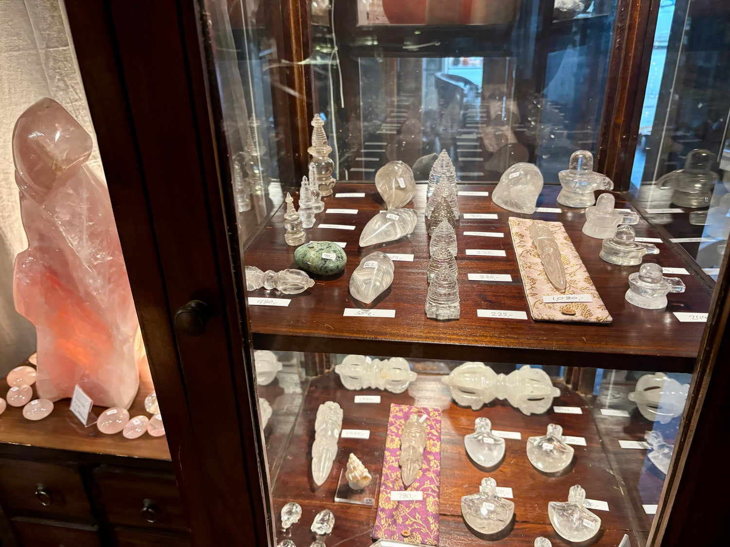 Her i krystalbutikkens bagerste lokale findes en stor variation af kvarts, ametyst og fluorit. Desuden et bord med hundrede af krystaller i flere former, nuancer og udtryk. På sidevæggen findes ca 200 forskellige lommesten, smykker, de formede krystaller samt de helt fine i glasskabene.
