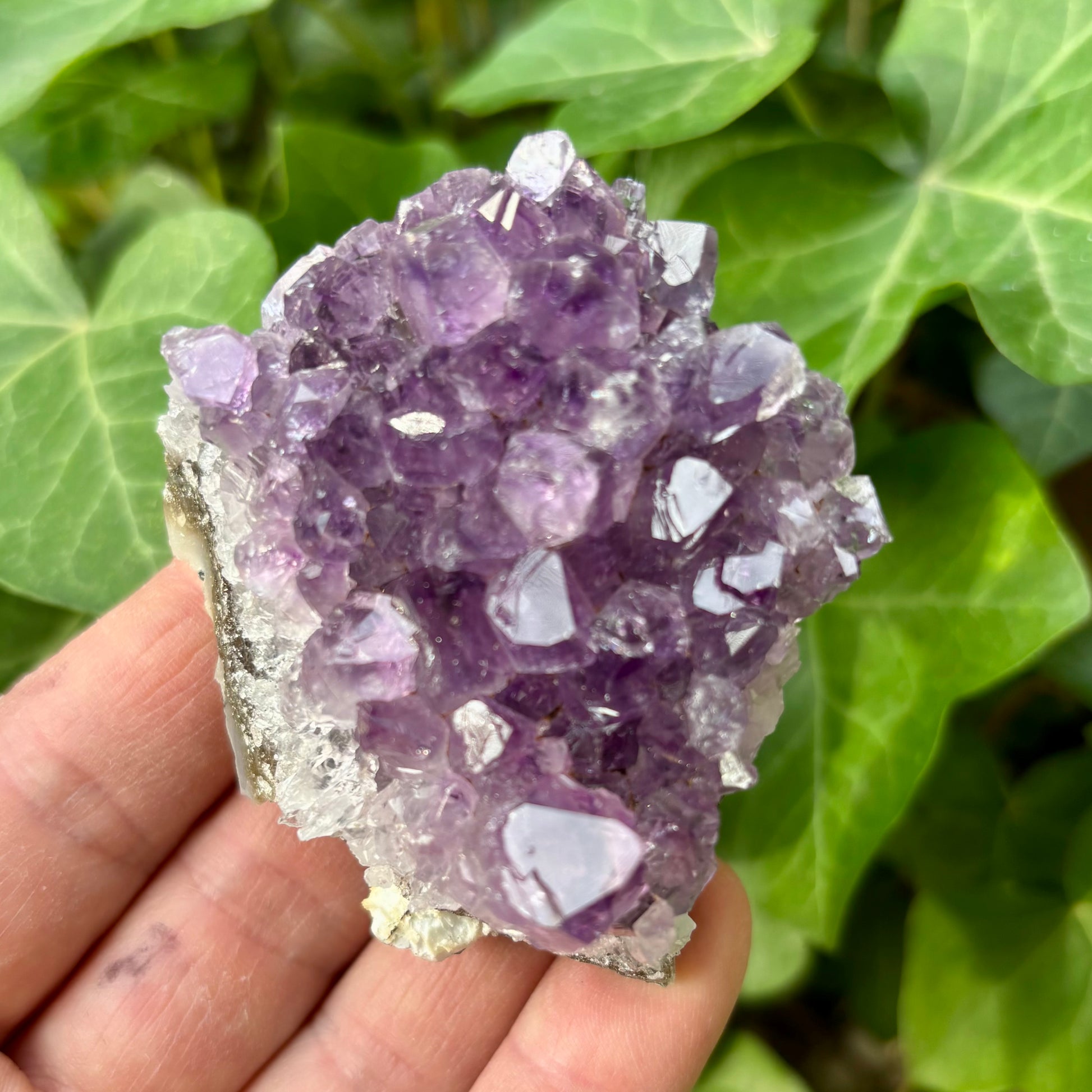 Ametyst fra Uruguay er berømt for sin intense, mørke lilla tone med en næsten fløjlsagtig dybde. Krystallerne er ofte tætstillede og små, hvilket giver klyngerne en særlig glans og tyngde. De har en mere koncentreret og beskyttende energi, som skaber ro, fokus og en følelse af indre styrke. Mange oplever dem som mere “mystiske” og jordforbindende end de brasilianske.