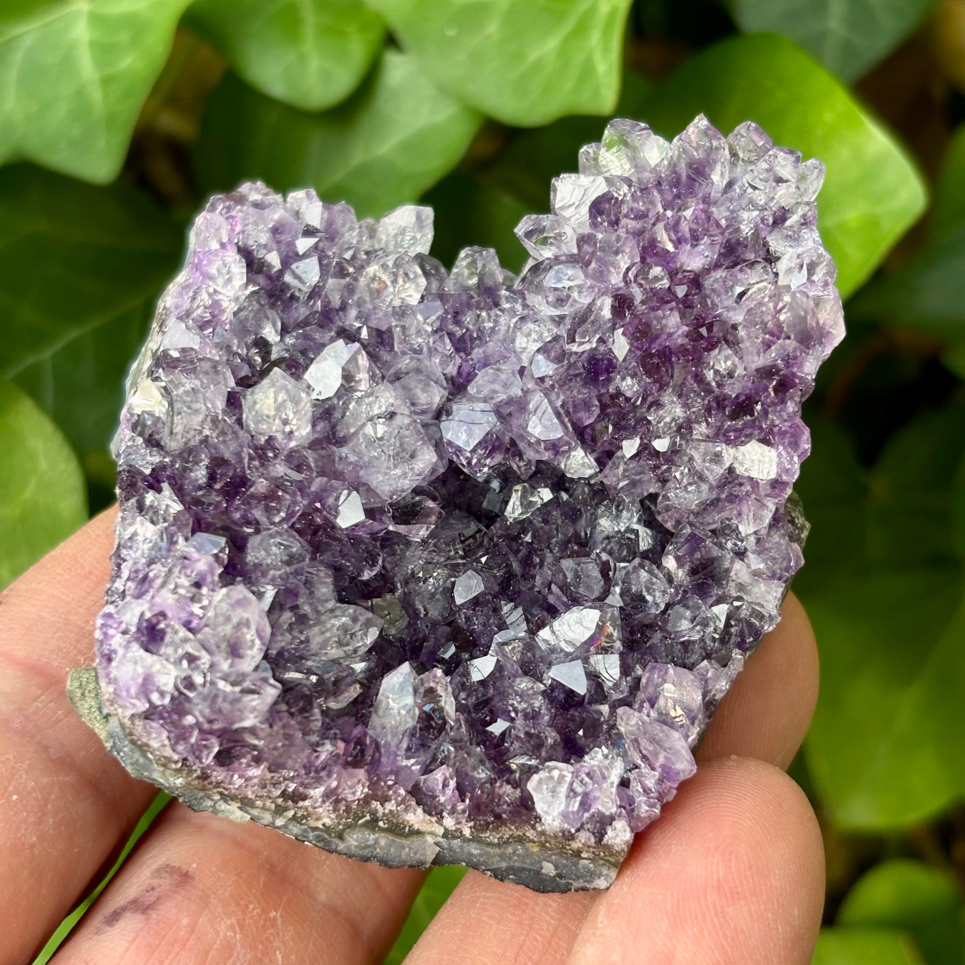 Ametyst fra Uruguay er berømt for sin intense, mørke lilla tone med en næsten fløjlsagtig dybde. Krystallerne er ofte tætstillede og små, hvilket giver klyngerne en særlig glans og tyngde. De har en mere koncentreret og beskyttende energi, som skaber ro, fokus og en følelse af indre styrke. Mange oplever dem som mere “mystiske” og jordforbindende end de brasilianske.