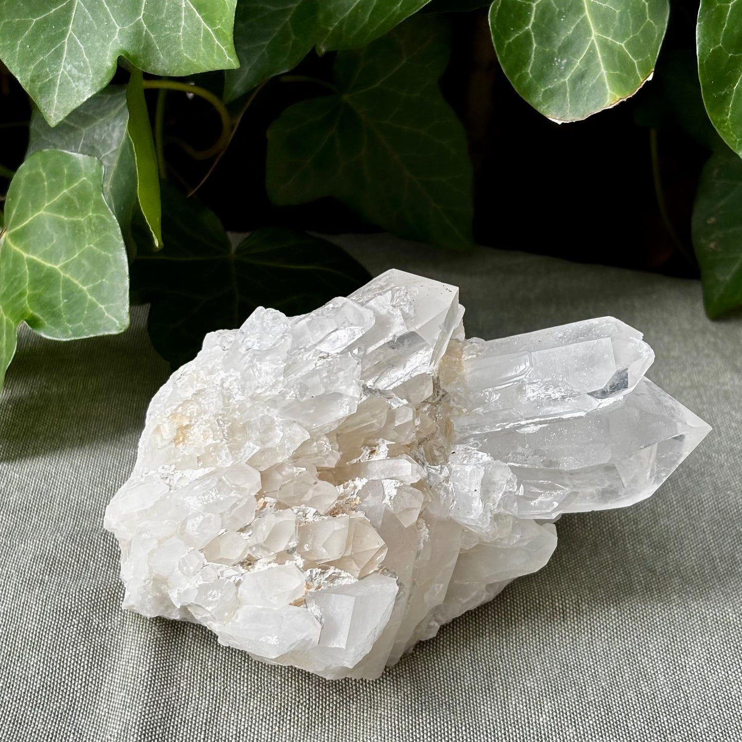 En smuk og helt naturlig kvartsklynge i en særlig form med al sin pragt. Både spidser og overfladerne er urørte, og med et væld af små spidser. Den har groet på en væg og det har givet en særligt formet bund. Den er derfor rigtig god at have i hånden til til bøn, ceremoni eller meditation.