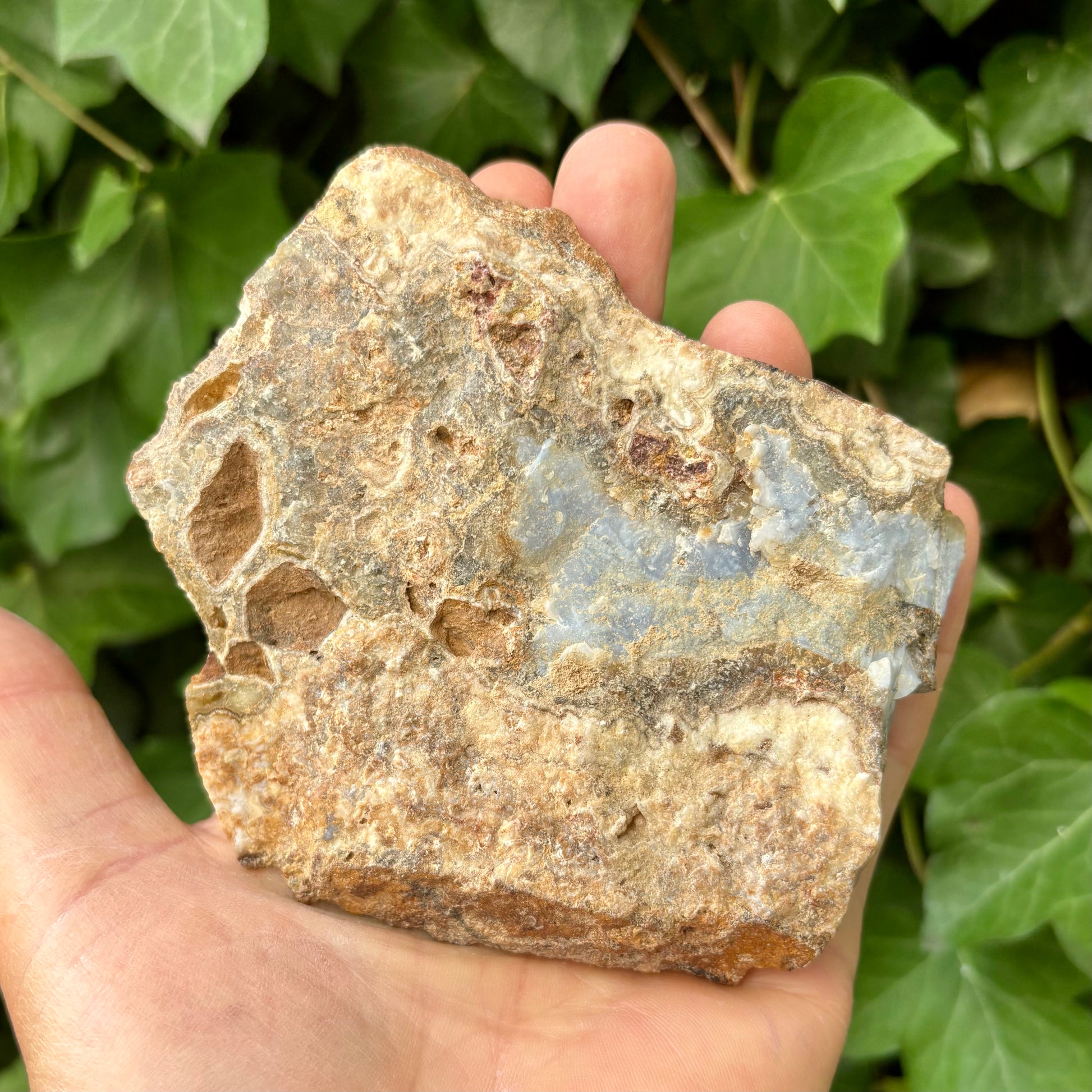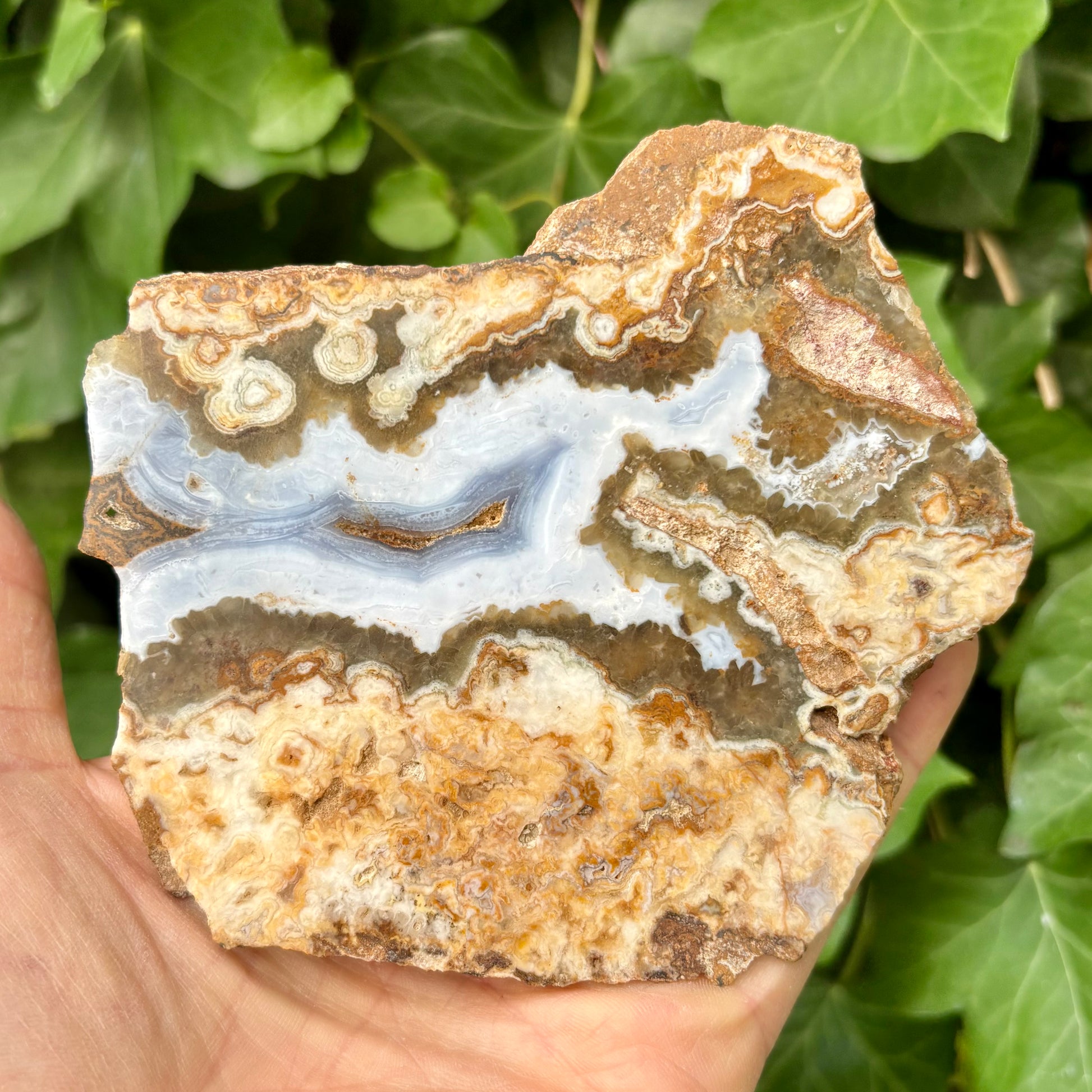 Det er en en interessant, smuk og poleret skive af blonde agat. omkring den blå agat findes crazy lace agat i sine creme og brune nuancer.