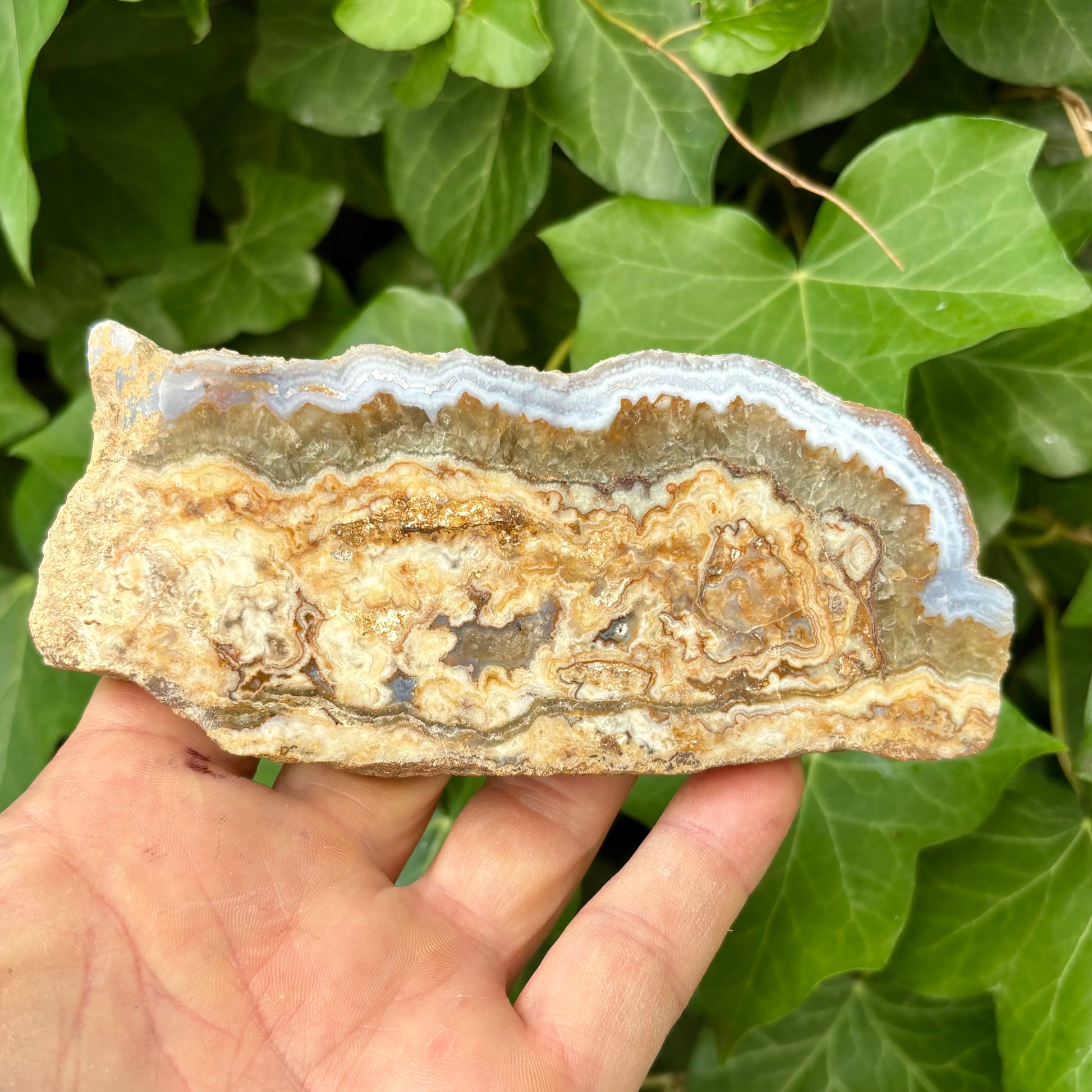 Det er en en interessant, smuk og poleret skive af blonde agat. omkring den blå agat findes crazy lace agat i sine creme og brune nuancer.