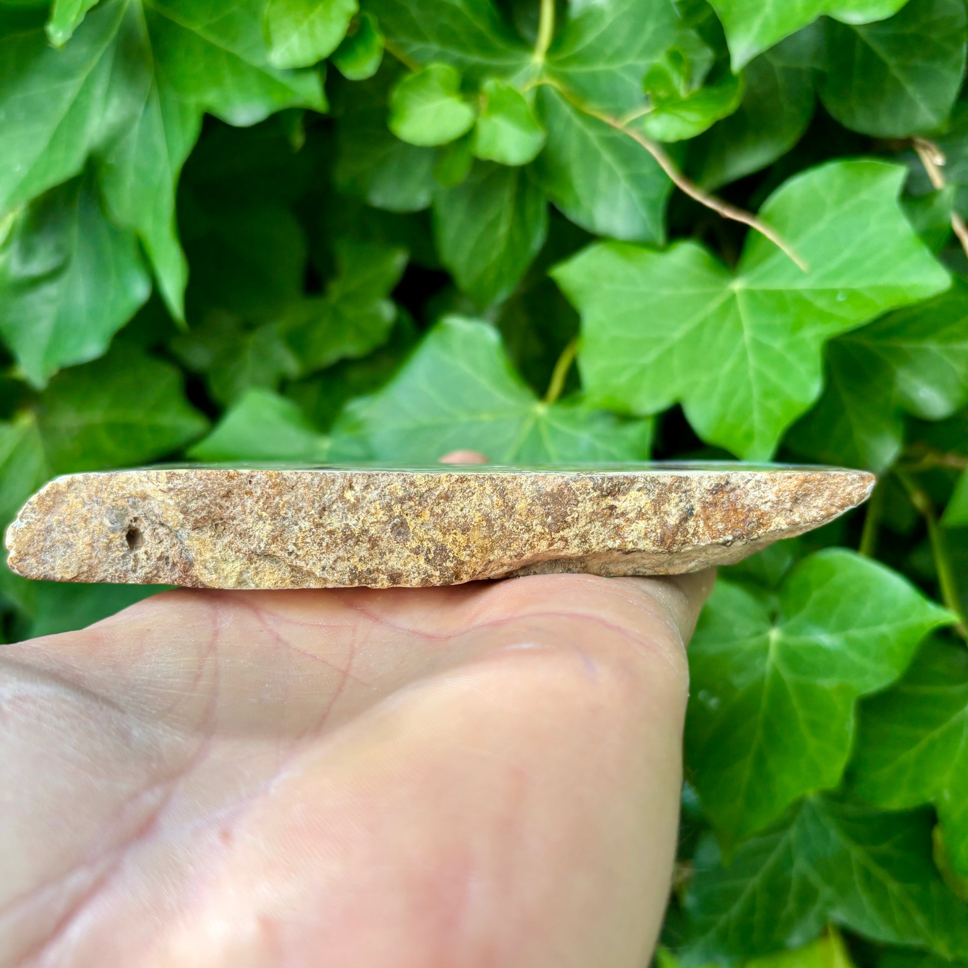 Den er blankpoleret på den ene side, mens den anden side står mat, som da den blev skåret.