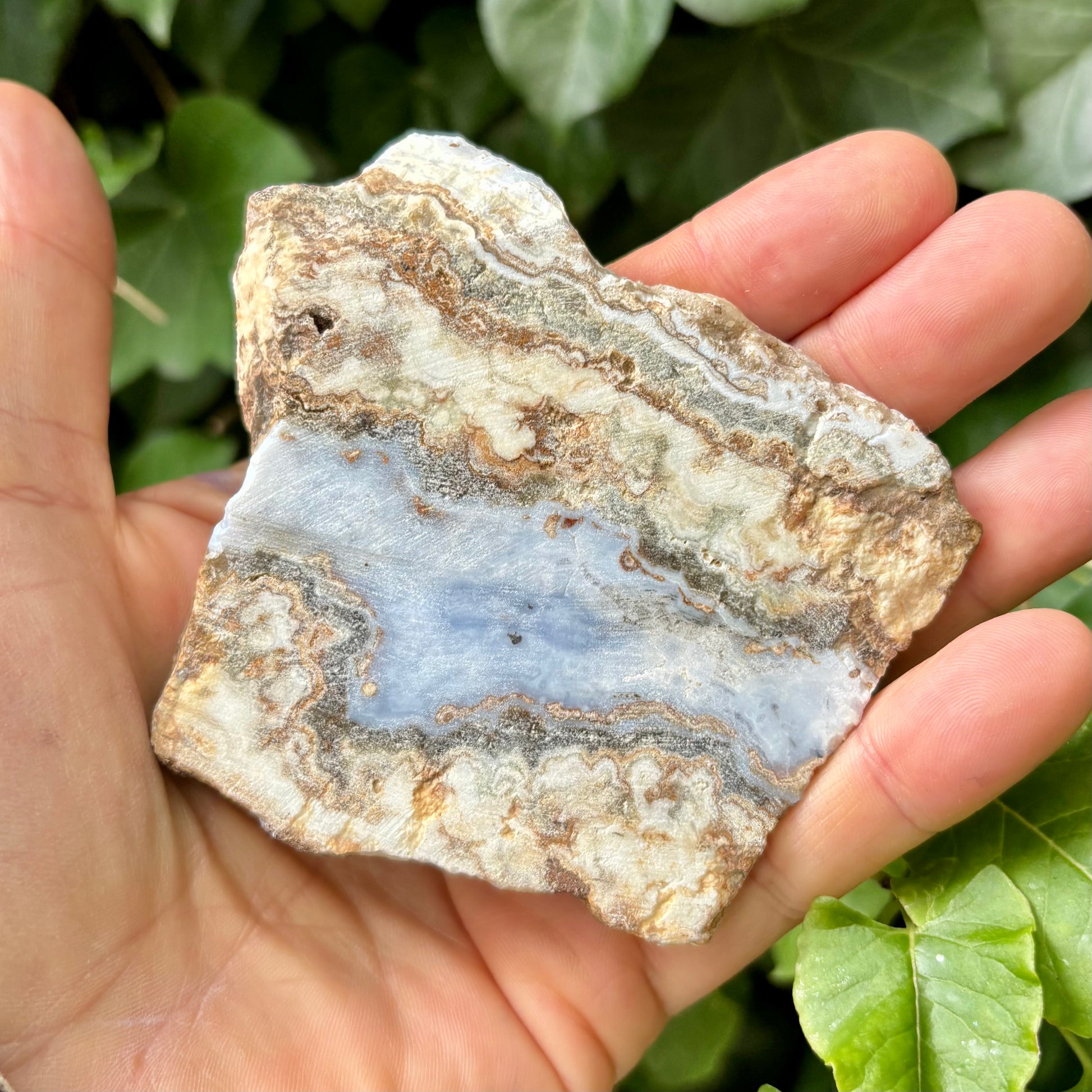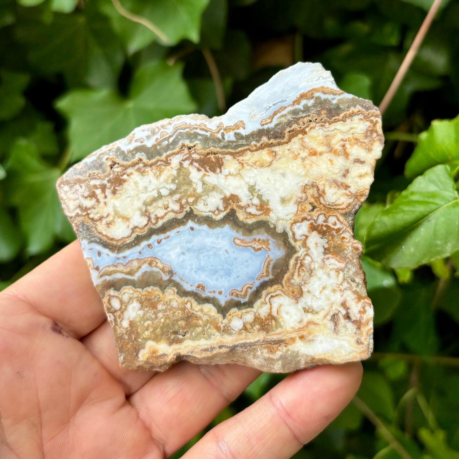 Det er en en interessant, smuk og poleret skive af blonde agat. omkring den blå agat findes crazy lace agat i sine creme og brune nuancer.