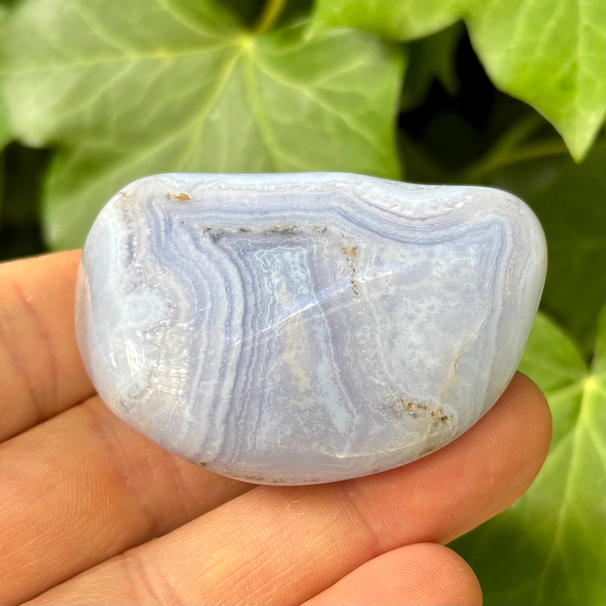 Det er en en blid og smuk og poleret blonde agat krystal. Også kaldet blue lace Agat eller blå chalcedon.