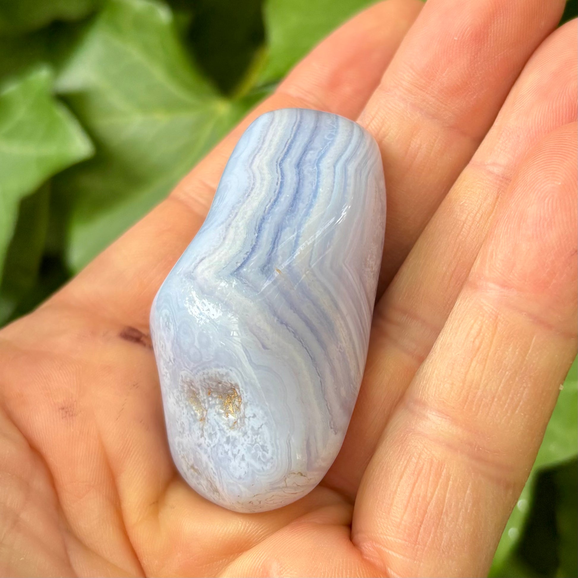 Det er en en blid og smuk og poleret blonde agat krystal. Også kaldet blue lace Agat eller blå chalcedon.