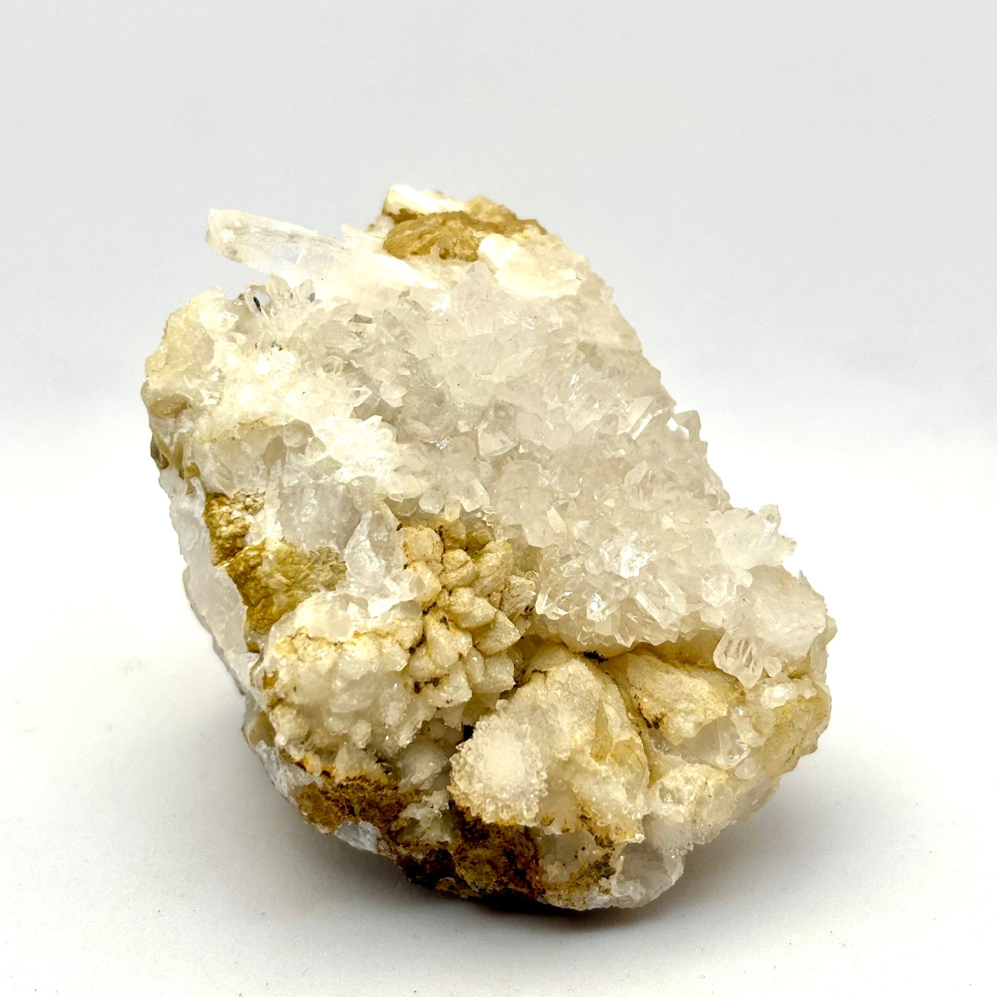 Dette er en Omukuruvaro eller Brandberg bjergkrystal. Den er helt særlig med flere klare bjergkrystaller og en blomsterkrukker af dogtoth Calcit.