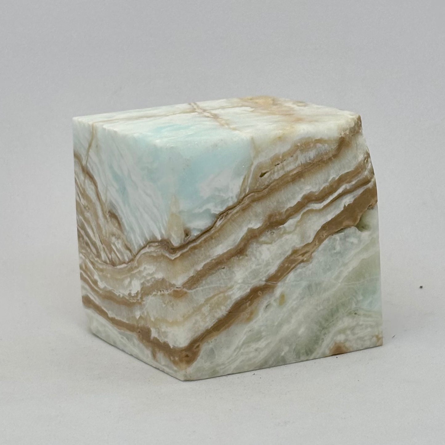 Dette er en helt unik kube eller terning af caribisk blå calcit. Kuben er slebet på det ene hjørne så den kan så med spidsen opad også.