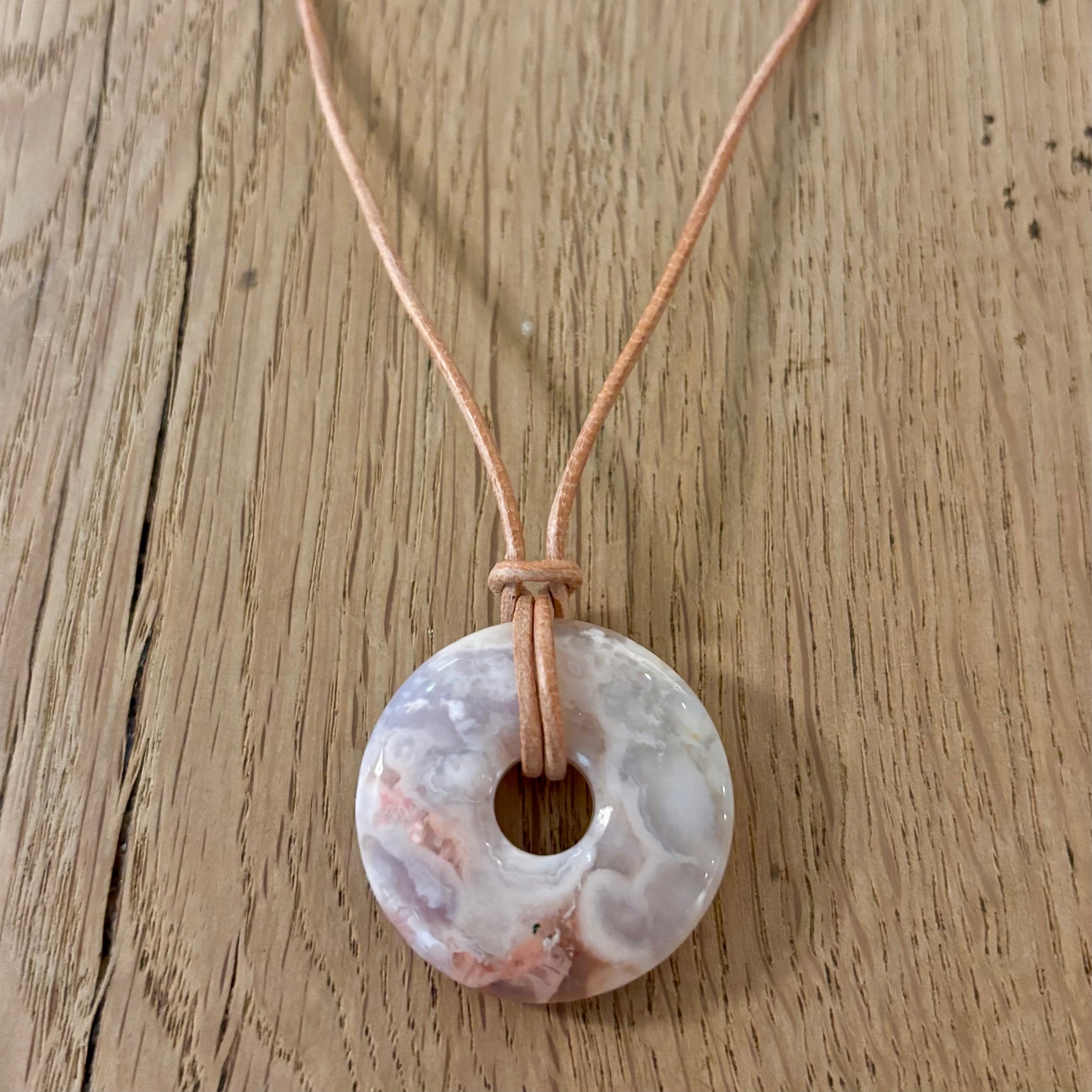 Her er en skindsnor med et vedhæng af cherry blossom agat eller blomster agat eller forstenet koral som det egentlig er.