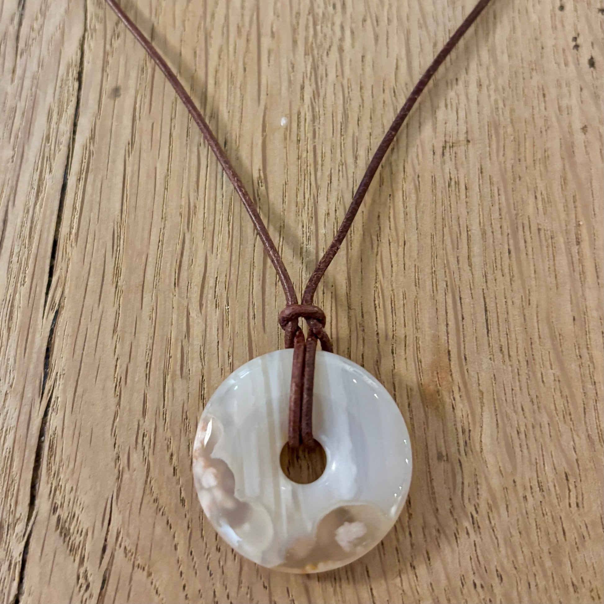 Her er en skindsnor med et vedhæng af cherry blossom agat eller blomster agat eller forstenet koral som det egentlig er.