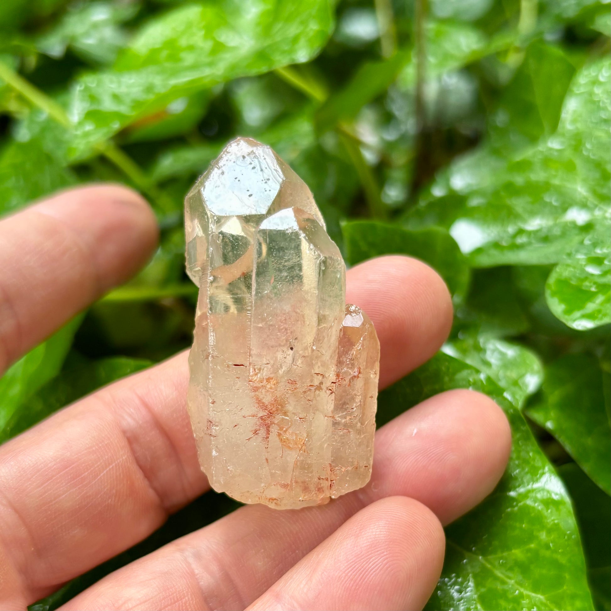 Køb hæmatoid bjergkrystal spids, ultra klar, og gyldenrød 5,5 cm i den lille krystalbutik i Valby