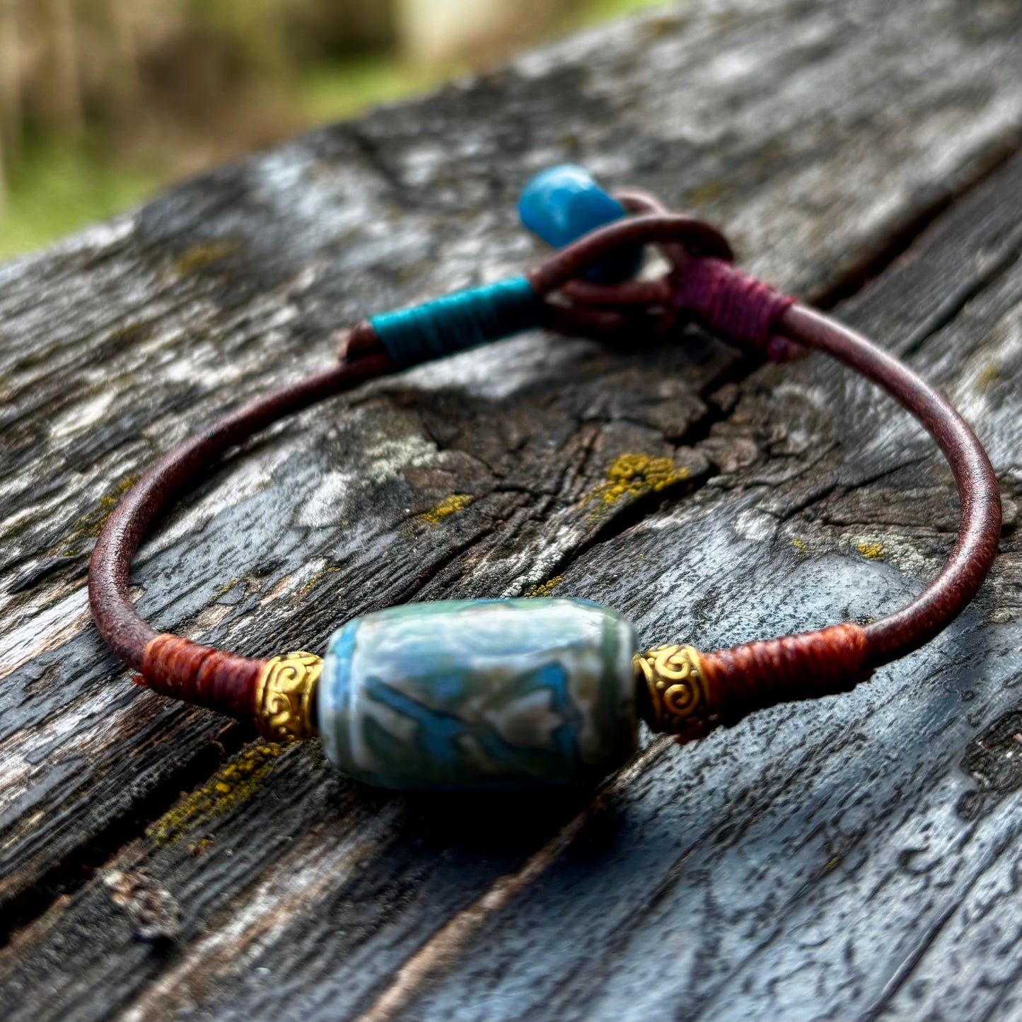 Det er også et unikt armbånd i dybe farver. Det er fremstillet i et værksted af en kraftig lædersnor med keramiske perler i blågrønne farver for og bag.