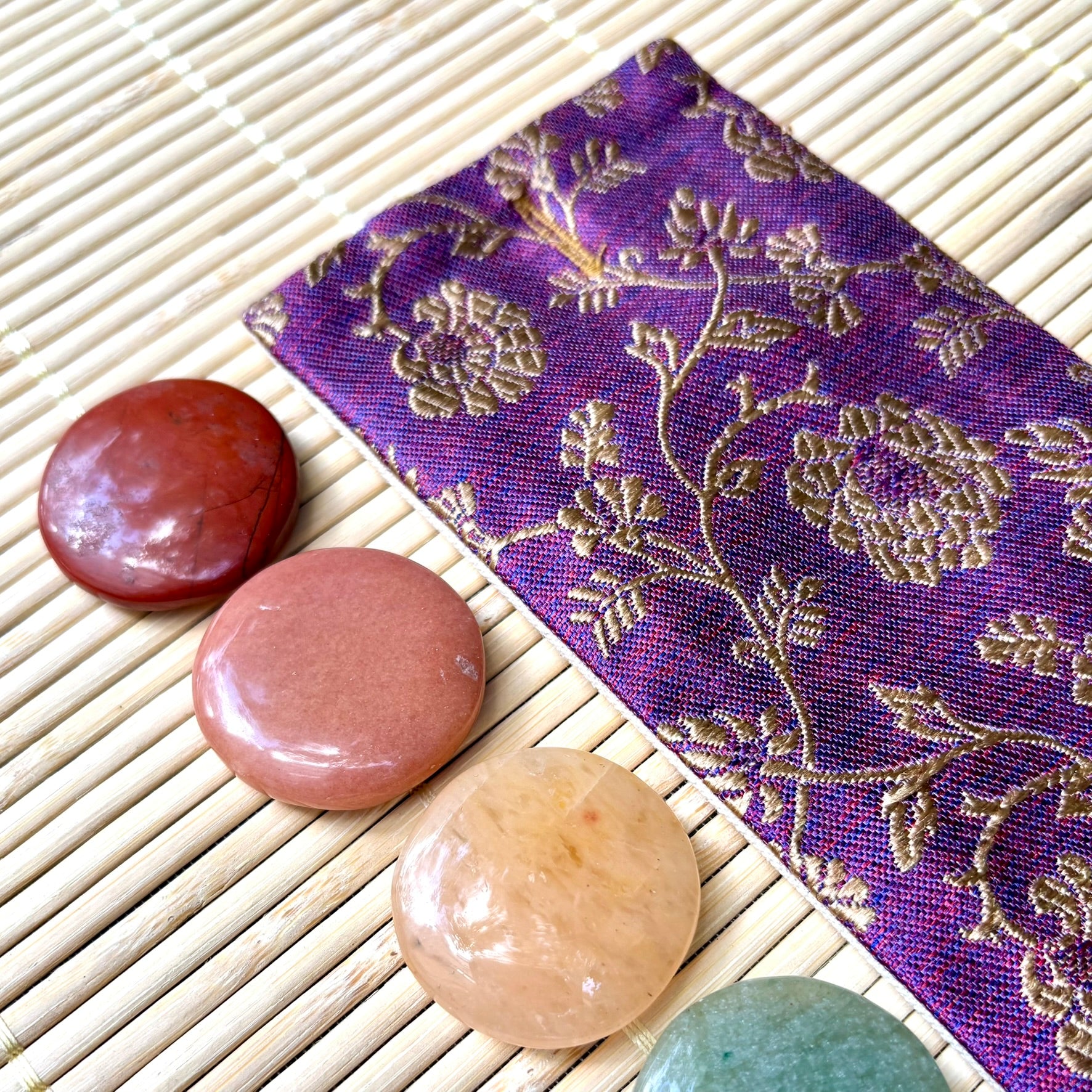 Purple Gold Flowers - Intention Wristband er ikke blot et smykke, det er et personligt redskab til at støtte dine intentioner i hverdagen. Armbåndet har en indbygget lomme, hvor du kan lægge en flad chakra-krystal, en seddel med et ønske, en affirmation, en intention eller en påmindelse til dig selv. Sådan bærer du netop den energi, du har brug for på dagen.