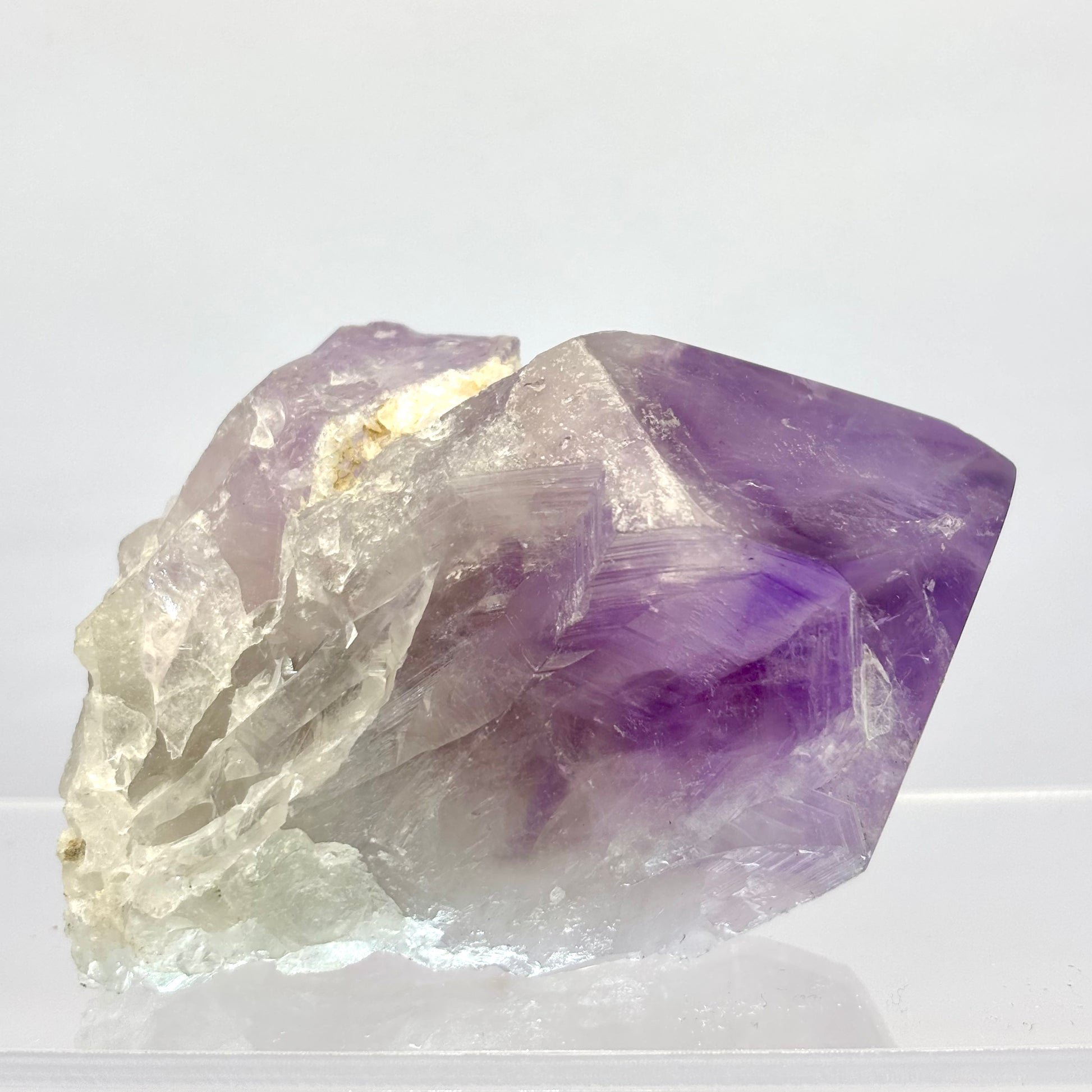 Ametysten er rå for neden og i sin oprindelige form. Terminationen er poleret