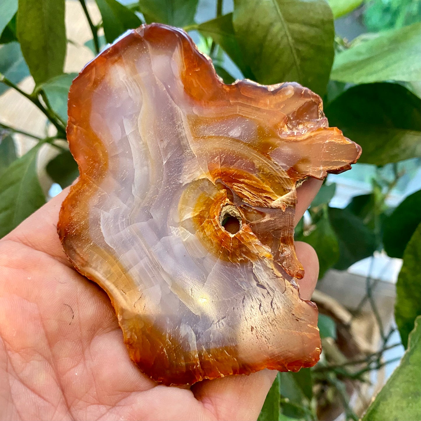 Fortryllende og varm skive af båndet karneol. Den er naturlig i hele konturen og poleret på fladerne så du virkelig kan få indblik i dens natur.