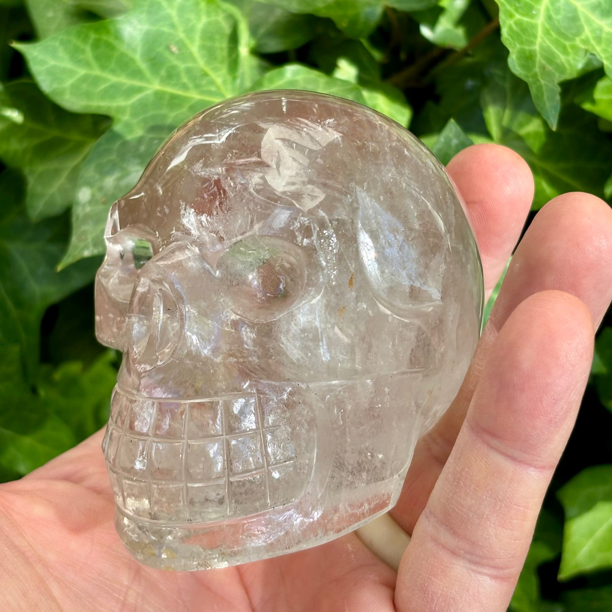Her ser du et krystal kranie udskåret i klar Himalaya bjergkrystal. Det er skåret i hånden, så selvom der er flere som minder om den, så er den helt unik.