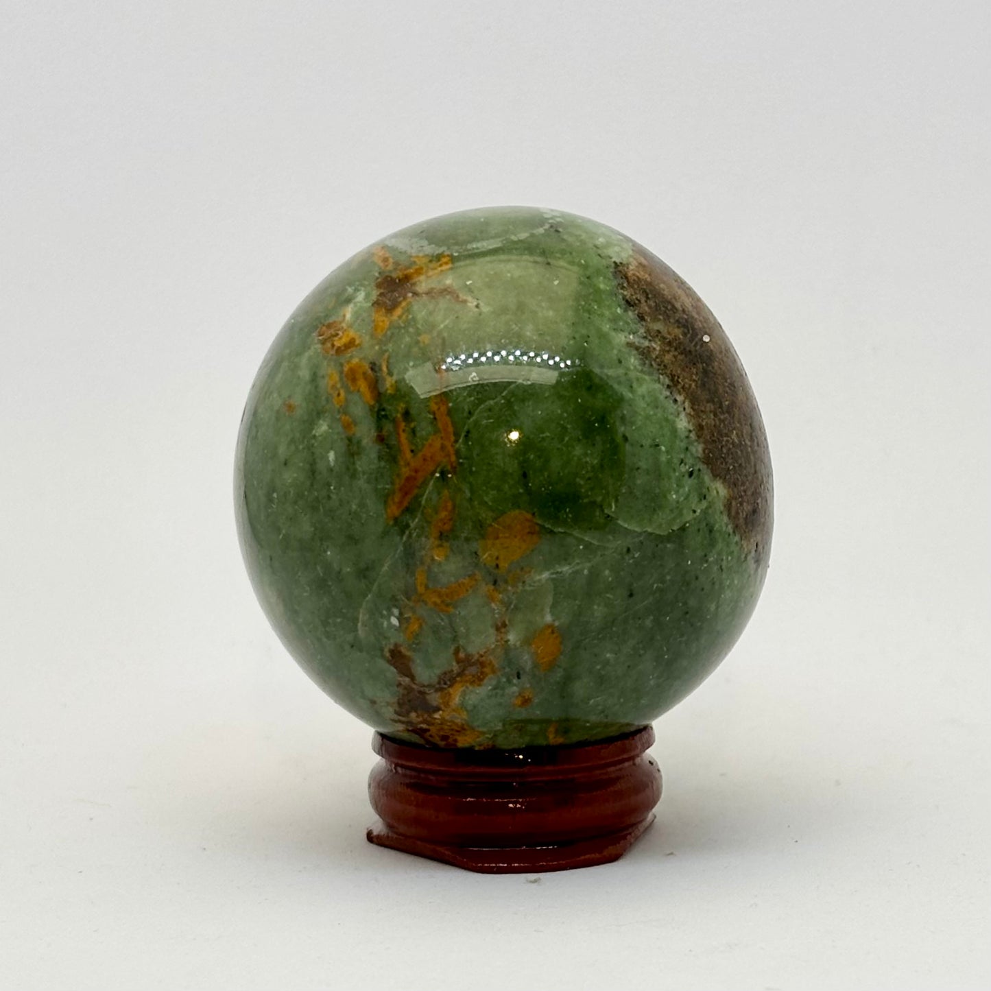 Smuk Chrysopras kugle med et mørkt brunt område i den ene side. Kuglerne er formede i hånden og netop denne bærer mere præg af det fordi en ikke er helt kuglerund.