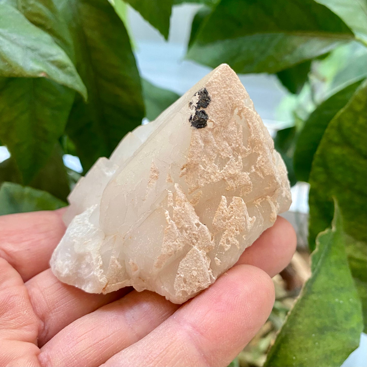 En smuk, helt naturlig kvartsklynge i en særlig form med al sin pragt. Der er record keepers og elestial fordybninger på siderne. Desuden et tyndt lag calcit på dens ene side