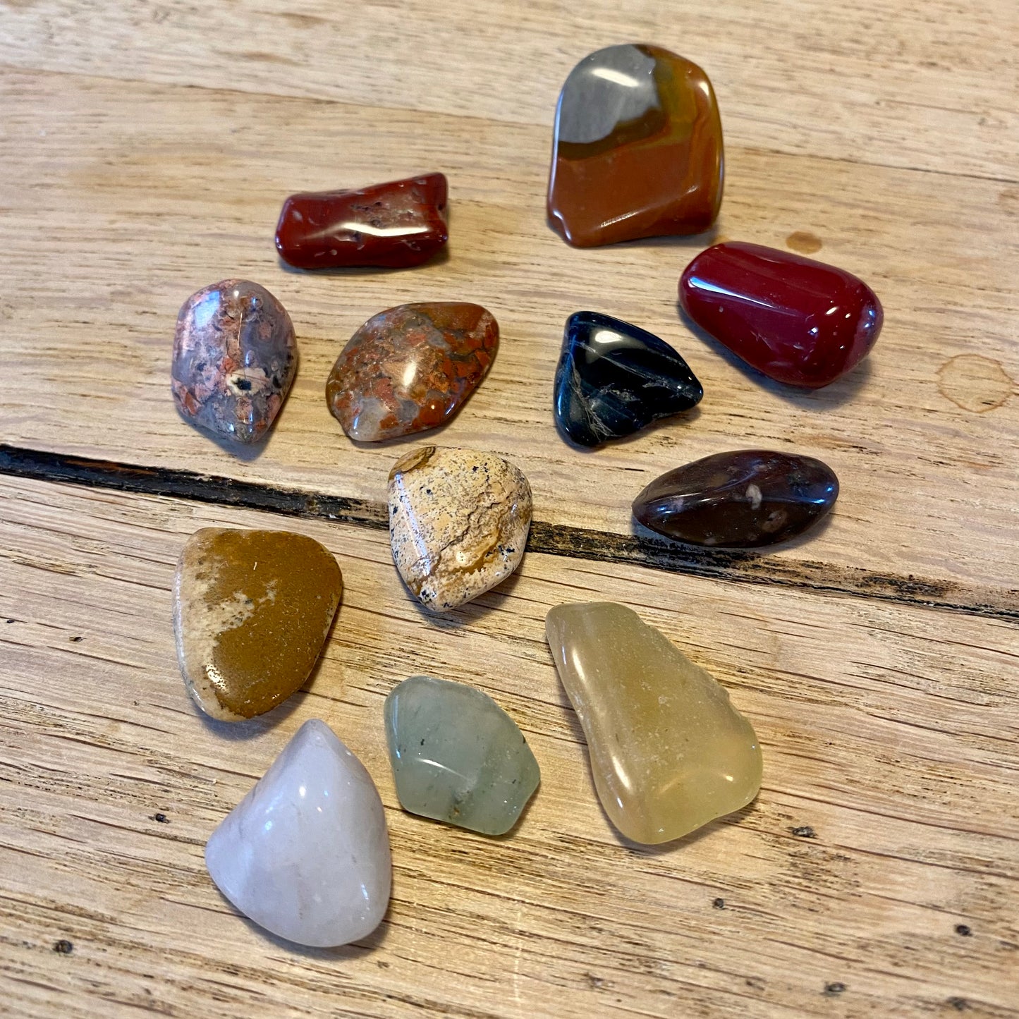 Lykkeposen grounding indeholder 12 lækre sten i størrelsen 1,5 til 3 cm. De fleste er omkring 2-2,5 cm. Det er overvejende forskellige jaspis, heraf en enkelt polychrome jaspis og en Mookait.