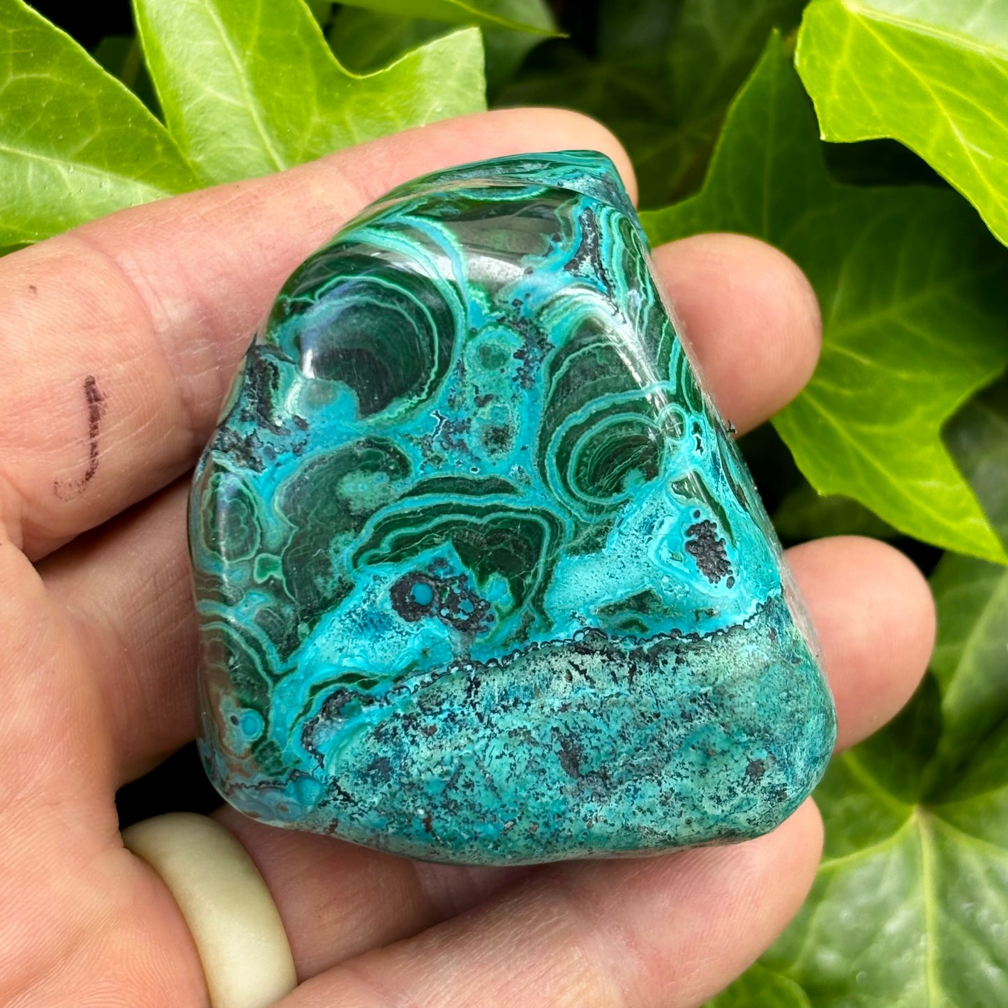 Malakolla er en kombination af Malakit og chrysocolla. Så smuk og ligger rigtig fint i hånden.