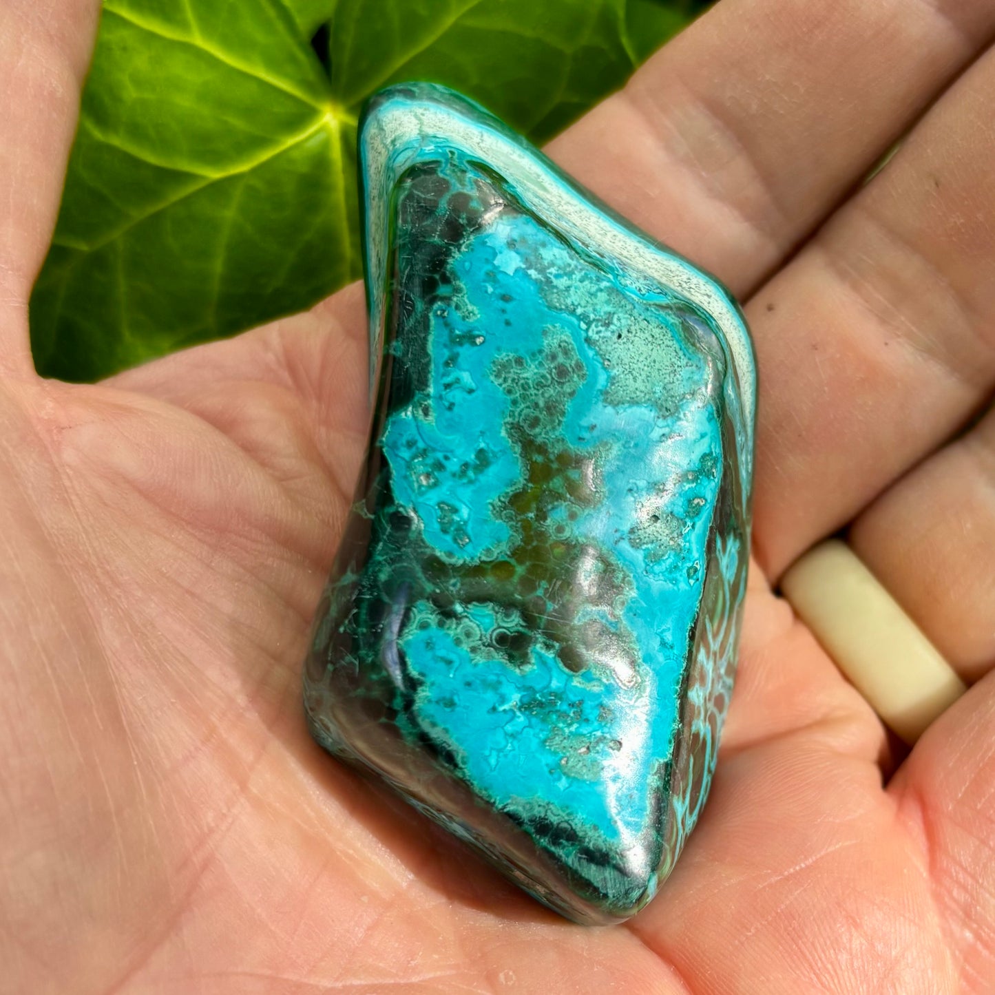 Malakolla er en kombination af Malakit og chrysocolla. Så smuk og ligger rigtig fint i hånden.