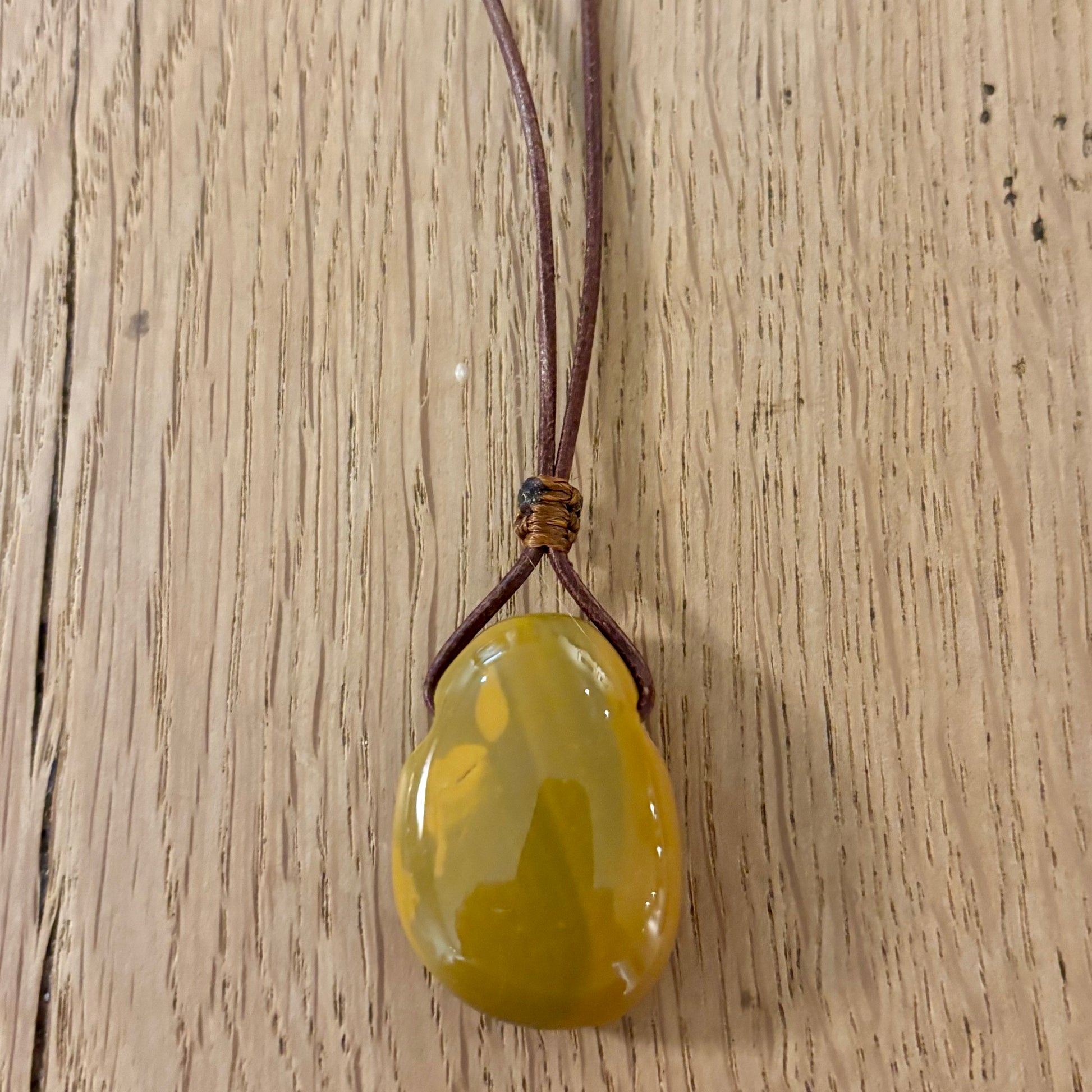 Vedhænget hænger i en skindsnor på ca 1 m. Den er åben bagtil.