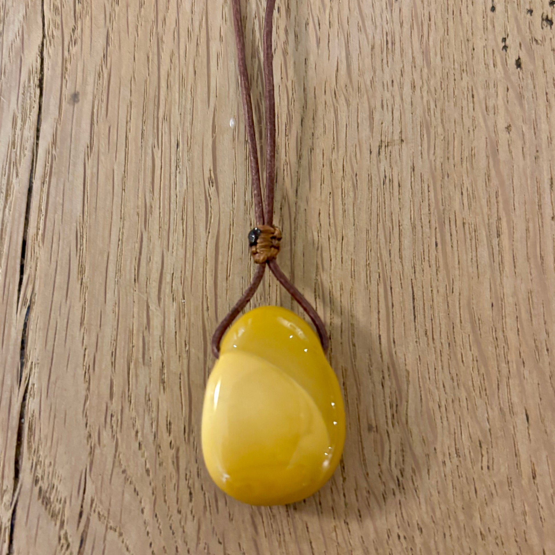 Vedhænget hænger i en skindsnor på ca 1 m. Den er åben bagtil.
