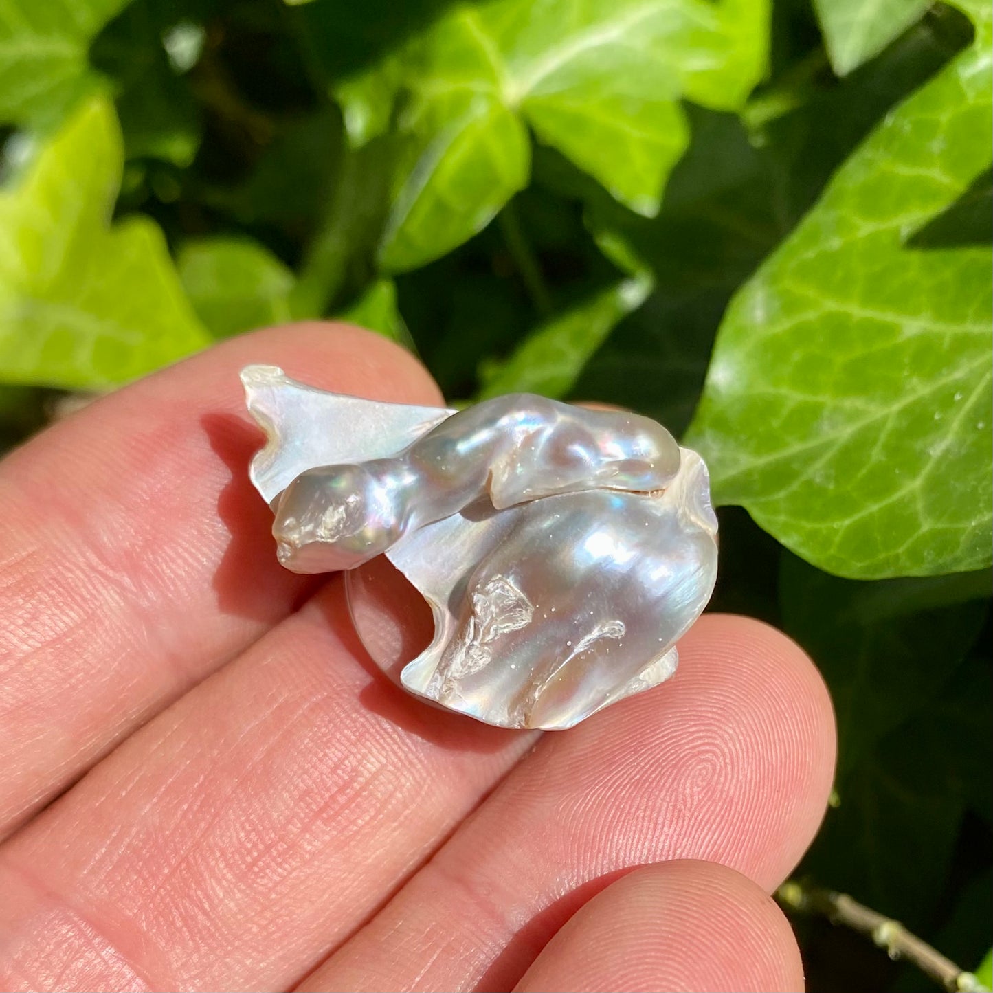 Her er en helt naturlig og skøn ferskvandsperle. Perlen er sat på en lille glasfod, men er lige til at tage af