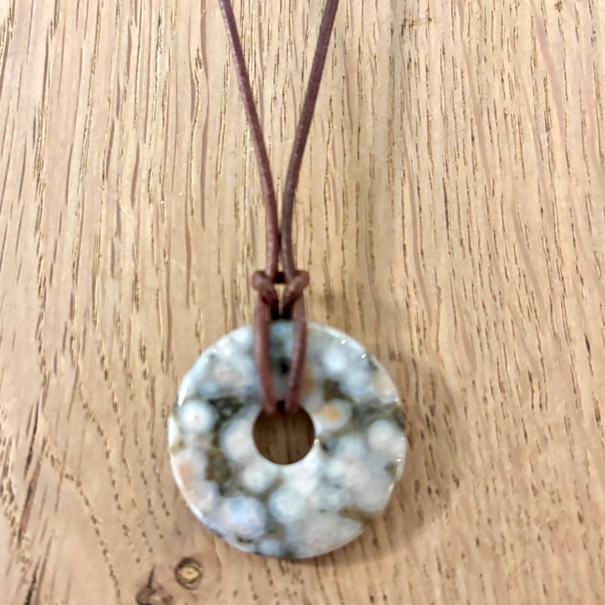 Her er en skindsnor halskæde med et vedhæng af ocean jaspis.