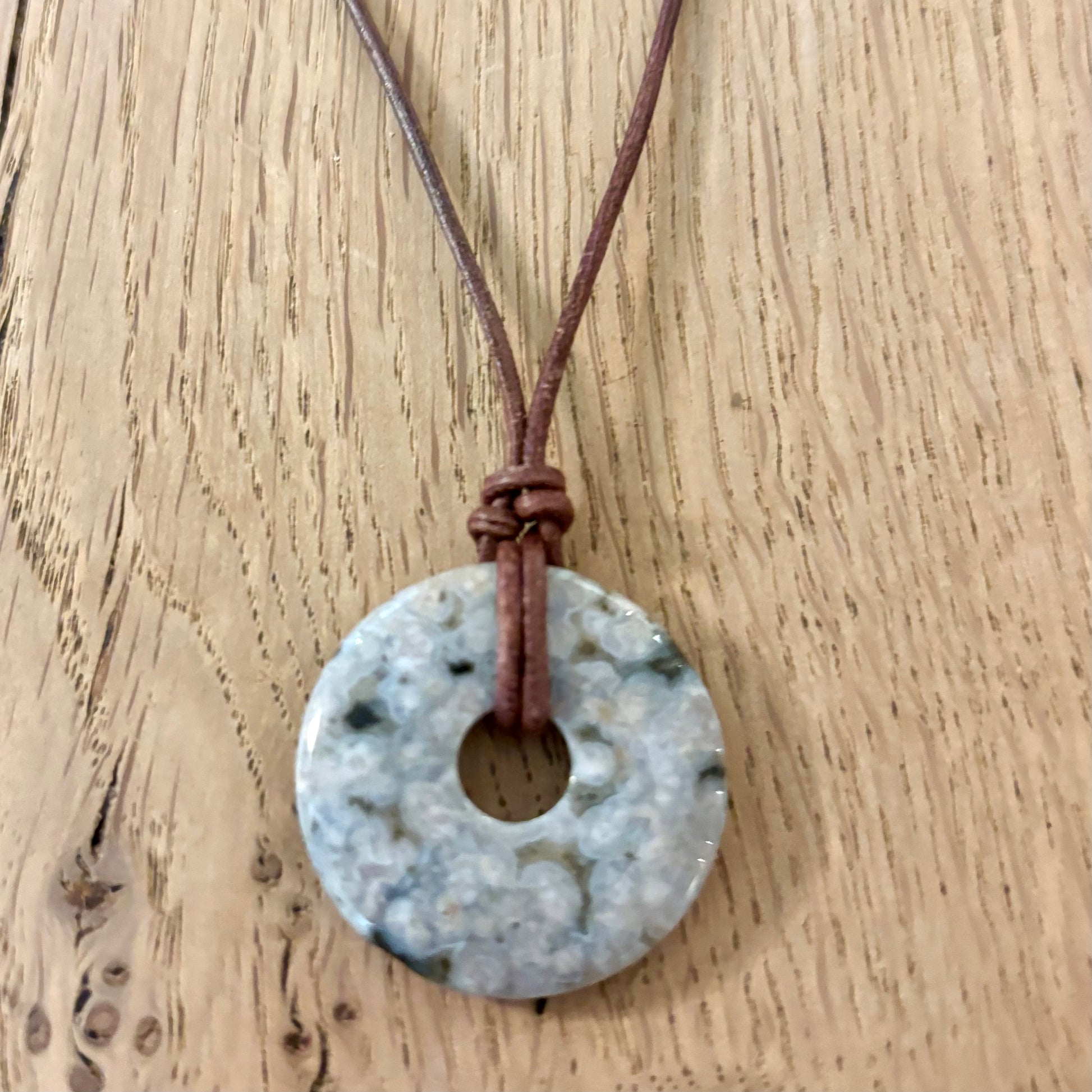 Her er en skindsnor halskæde med et vedhæng af ocean jaspis.