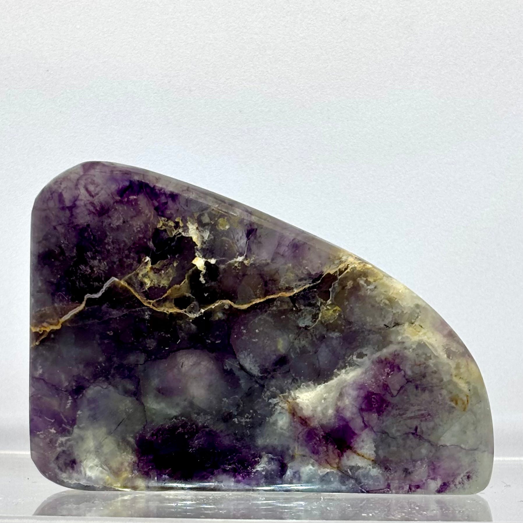Flot Regnbue fluorit skive som inviterer til dybe oplevelser. Poleret og stadig rustik i sit udtryk med en lille grotte fra den ene side. Fantastisk unik. Den er lidt rustik i kanterne. Billedet er taget med belysning nedefra, hvilket gør den rigtig flot