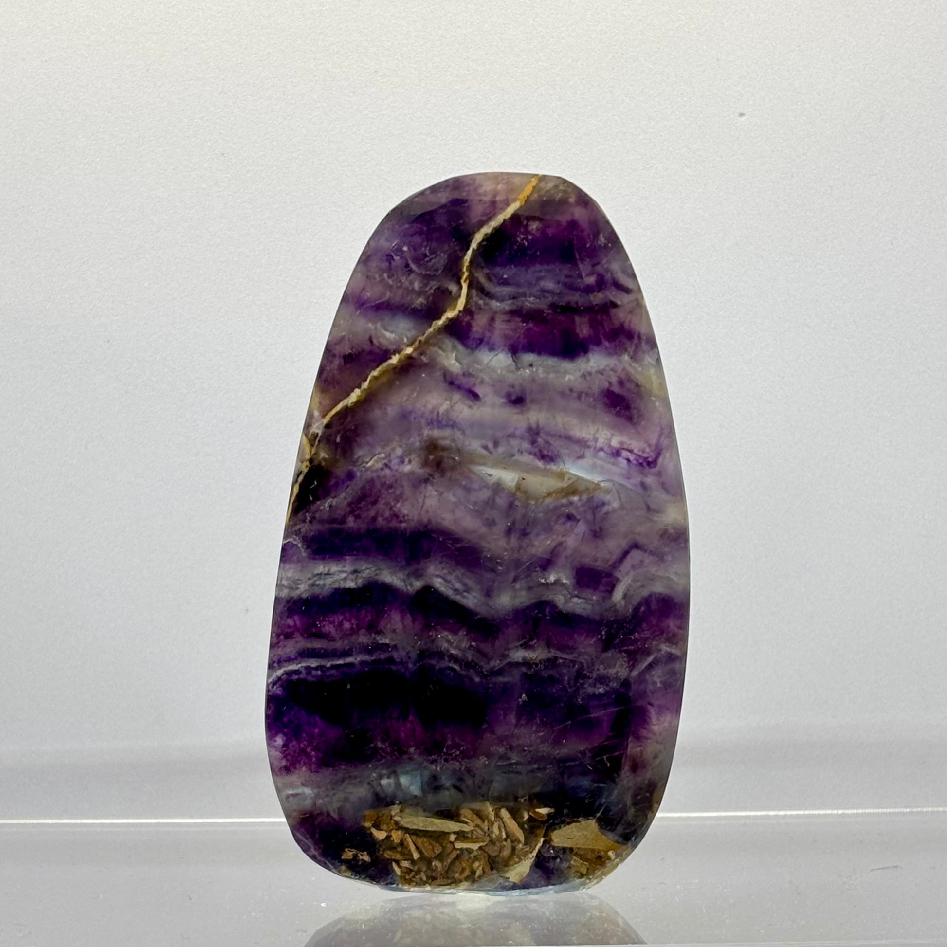 Flot Regnbue fluorit skive som inviterer til dybe oplevelser. Poleret og stadig rustik i sit udtryk med en lille grotte fra den ene side. Fantastisk unik. Den er lidt rustik i kanterne. Billedet er taget med belysning nedefra, hvilket gør den rigtig flot